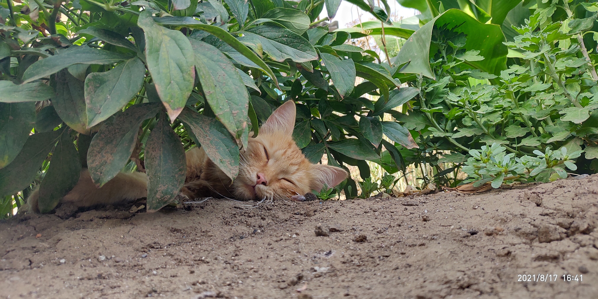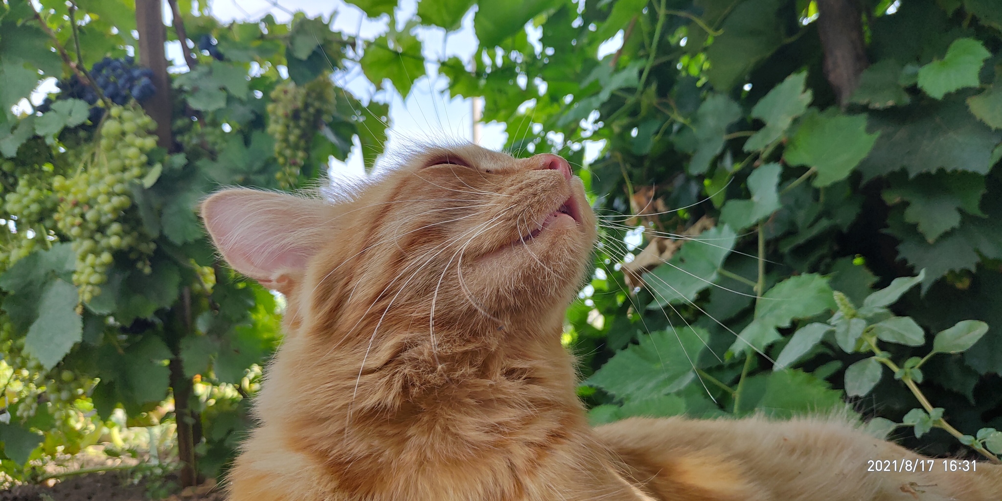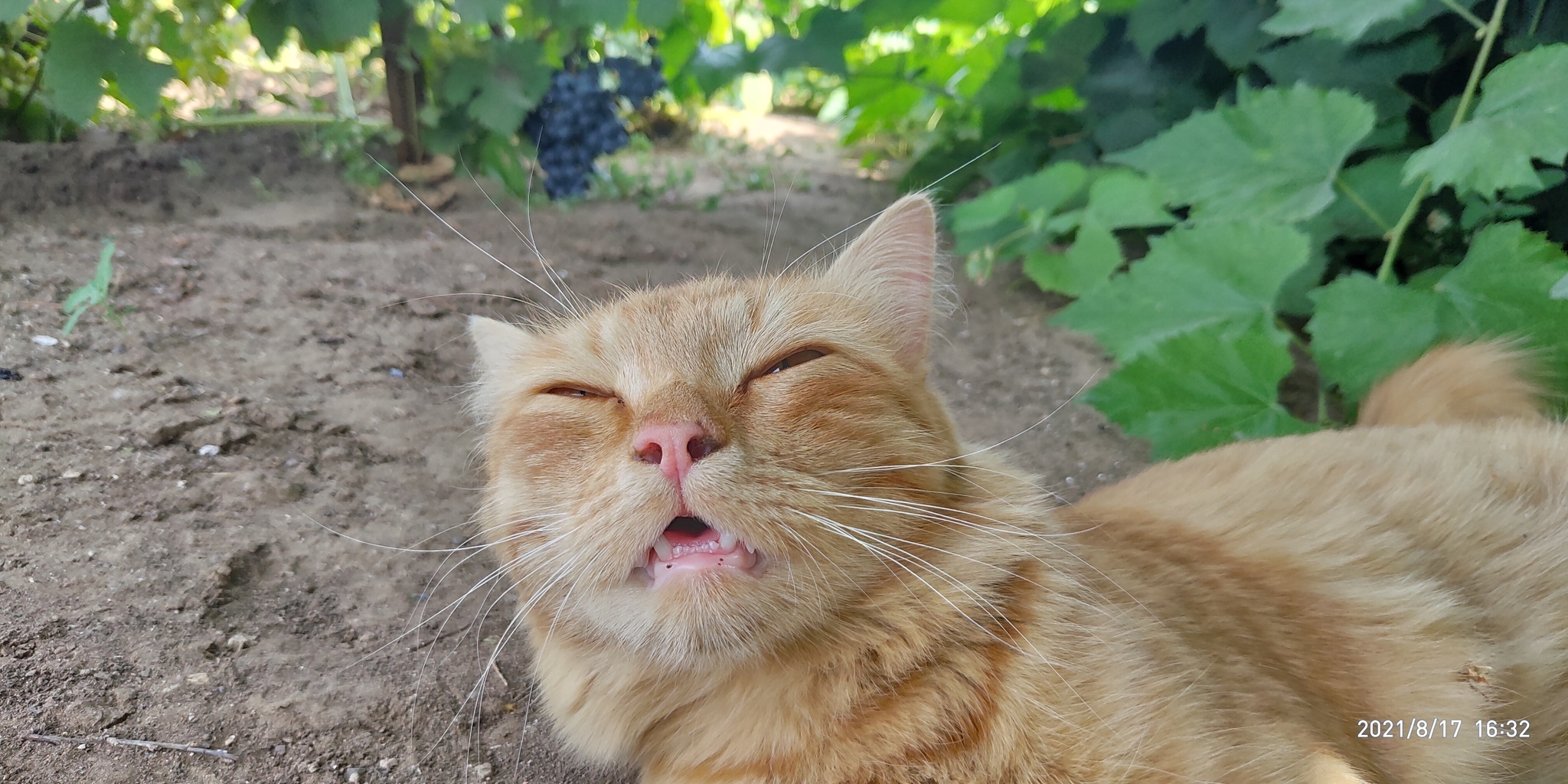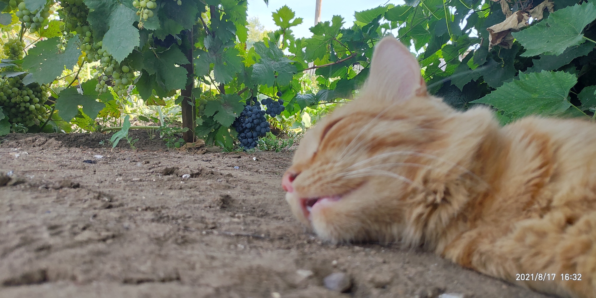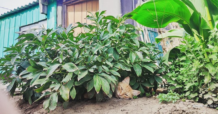 Приехал в Оренбургскую область, тут жара, в теньке +38. Вышел покурить, вижу, на огороде рыжего котика помирающего от духоты, вынес молоко и воды, потом он отблагодарил меня позированием для фотосессии)
