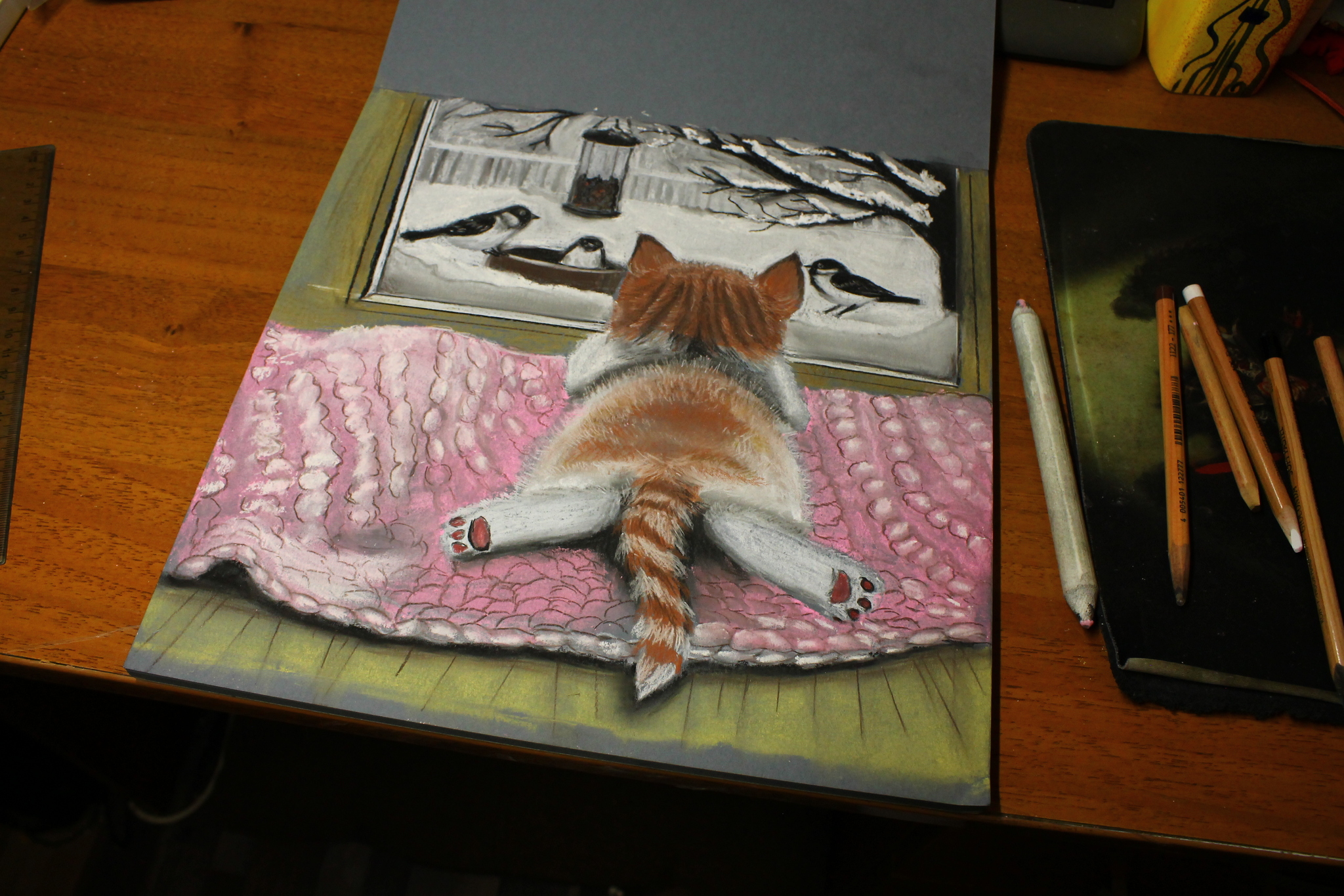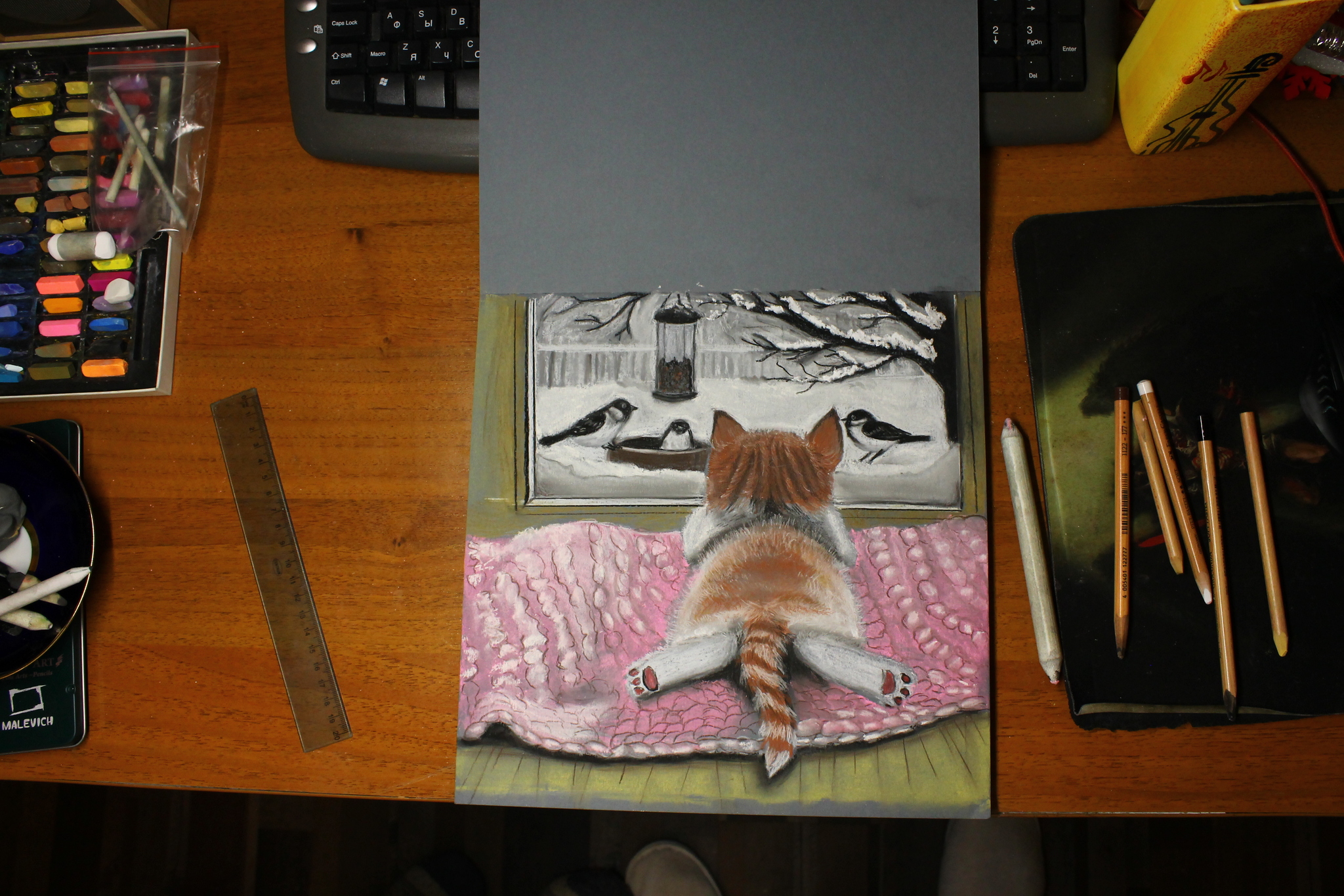 На этом очаровательном рисунке мы видим маленького рыжего котенка, уютно устроившегося на пушистом розовом пледе. Он смотрит в окно, за которым царит зимний пейзаж. Снег покрывает землю и ветки деревьев, создавая атмосферу спокойствия и чистоты.