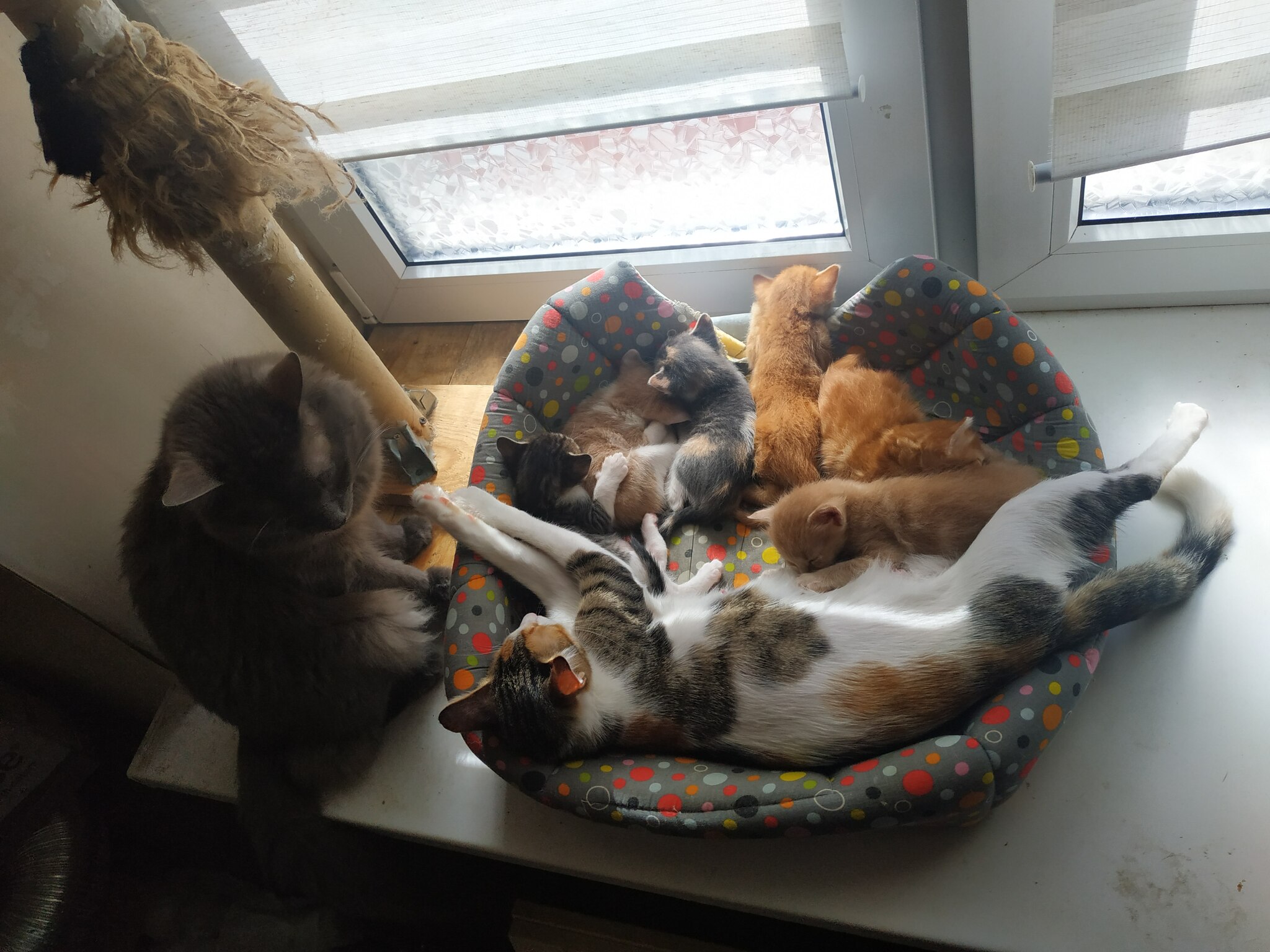 Родилось 6 котят у Сонечки. Жили 3 недели в темном шкафу. Утром жена заходит на кухню, а там кошка втихаря перенесла все семейство на подоконник в лежанку и они как миниподсолнухи смотрят на нее - вытянули шеи и глазами хлопают, зевают .