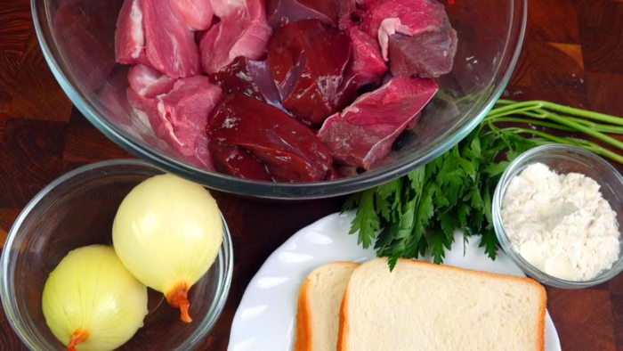 Мясо и печень порезать на кусочки для мясорубки и пропустить через неё 1 раз.