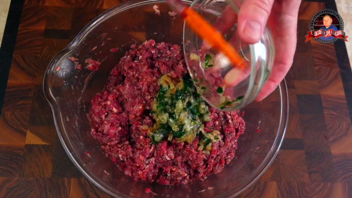 Добавить в фарш по вкусу соль и молотый чёрный перец. После чего добавить охлаждённый лук с петрушкой. Перемешать.