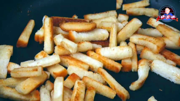 Пока фарш отдыхает, нарезать тостовый хлеб соломкой. Обжарить его на масле до румяного состояния. Выложить на блюдо, засланное бумажной салфеткой.