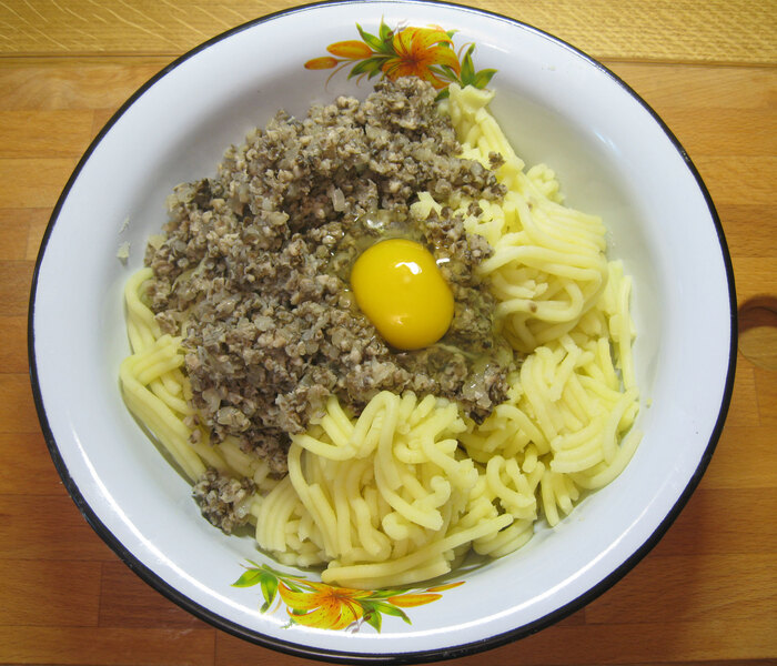 Прокручиваем картофель через мясорубку, так же поступаем с луком и грибами. Вводим яйцо.