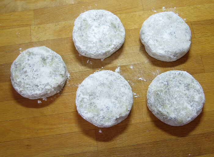 Вымешиваем фарш, солим по вкусу, формуем котлеты и обваливаем в муке. При формовке смачиваем руки водой, иначе к ним будет прилипать фарш.
