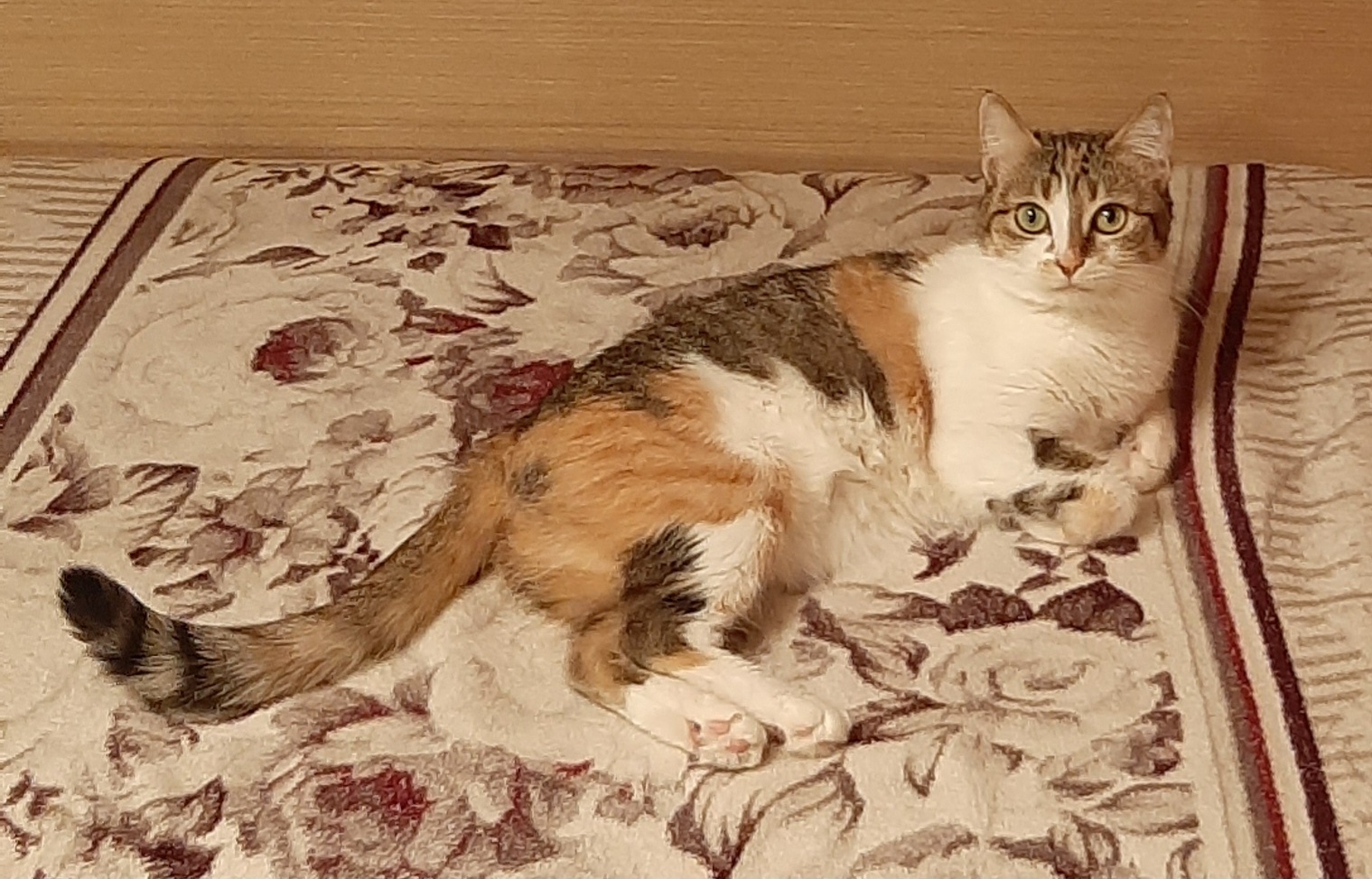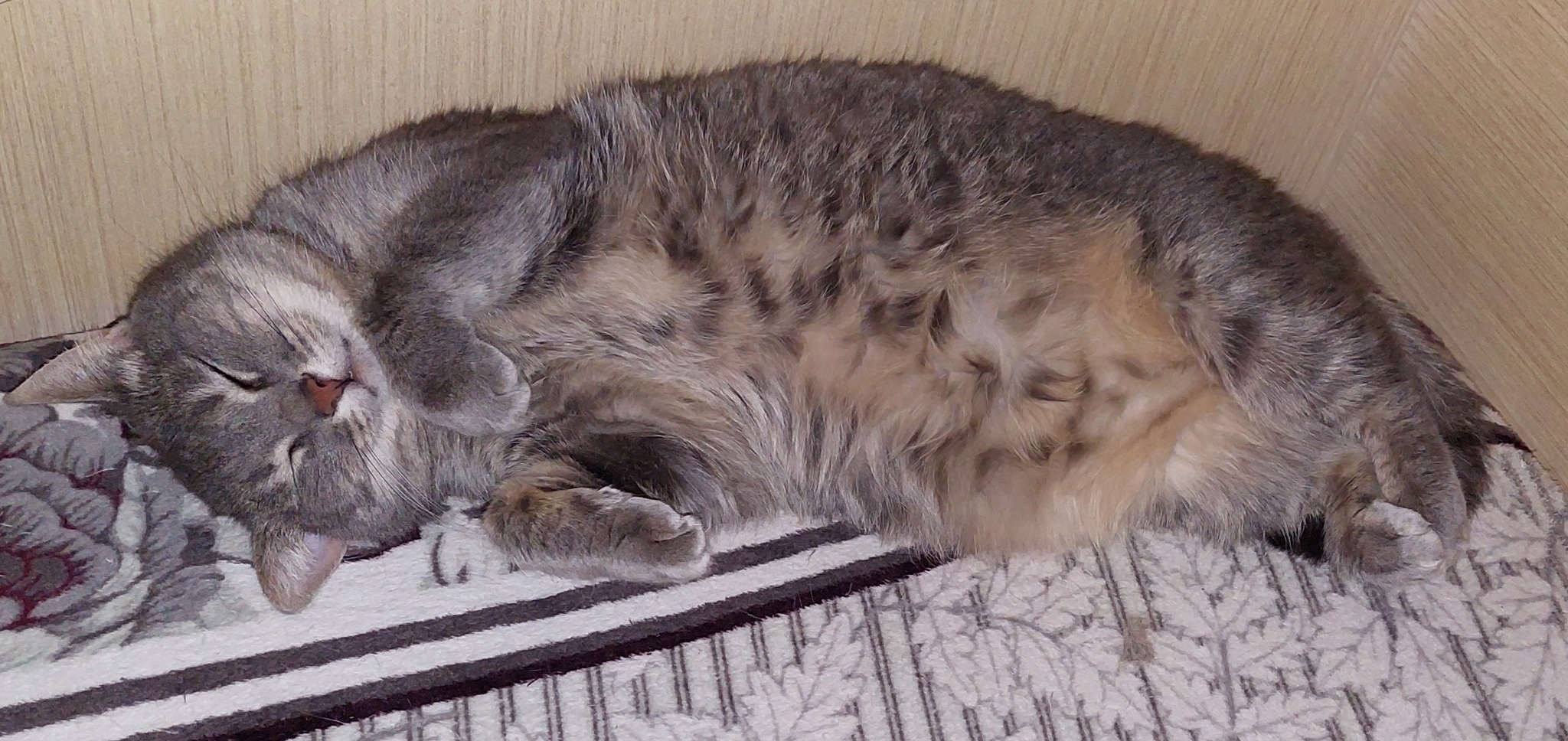 Пуська, после своих дурацких "летних каникул" на улице не оправилась. Сломанное бедро собаками, а также наличие кальцивироза добили. Кошка и выглядит и чувствует себя ужасно, пытаемся делать, что можем, но даже в приличный вид привести не можем, поэтому фото свежего не будет, извините. Пусть будет то, какой она всегда была, гулена наша (((