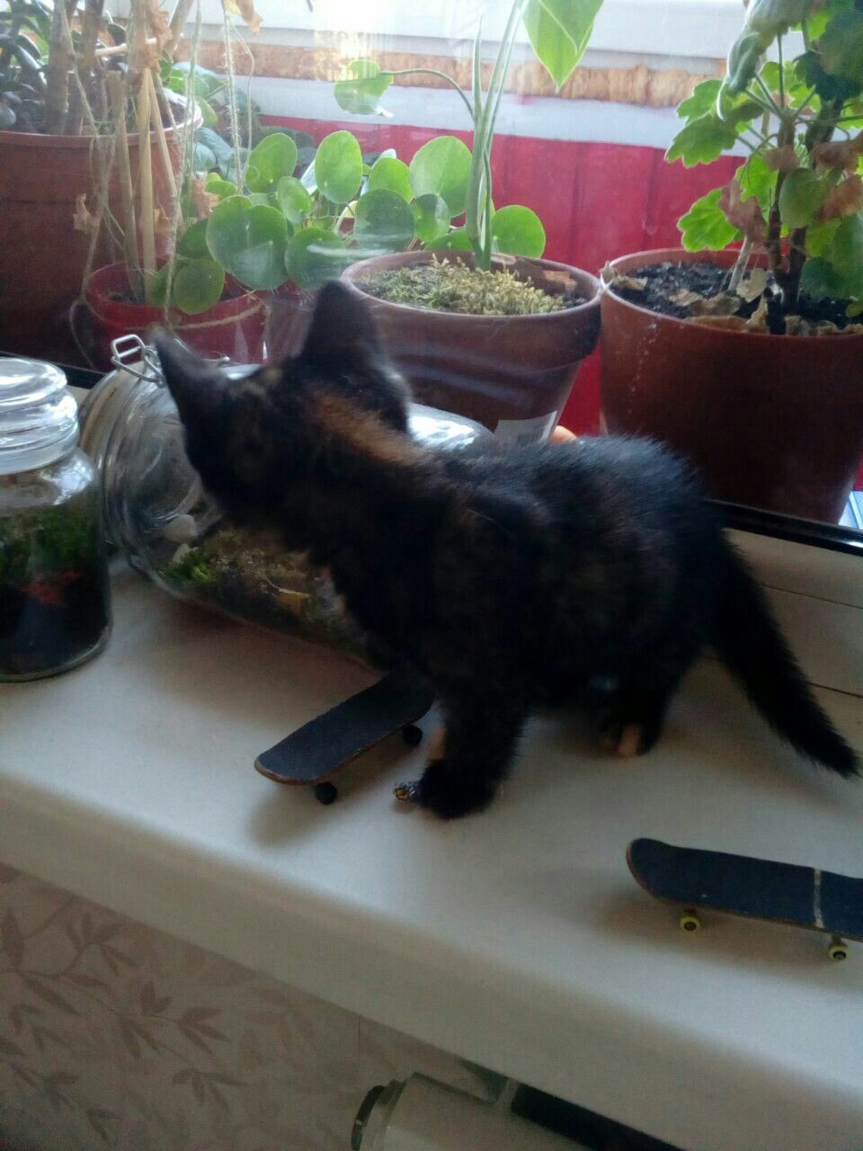 Знакомьтесь, дерзкая, как понос, но очень милая крошка-кошка. В комплекте черный и кремовый носочки на передних лапках. Дерется с пакетом, шипит на местных котогопников, однако ходит в лоток и спит с нами, так что всё ок :)