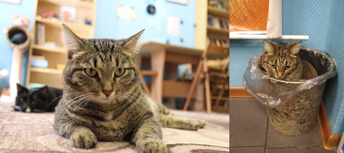 С момента появления Фроси в кафе снова воцарился покой. Коты хорошо знают, что можно, а что нельзя, и еще лучше знают, что им за это будет. А Фрося часто нервничает, заедает стресс, и давно уже совсем не напоминает себя прежнюю. В мусорное ведро она сейчас не садится, а ввинчивается, кряхтя и подбирая свисающие бока. Но это ее не останавливает - где ж еще подумать над стратегическим развитием кафе, как не в мусорном ведре?
