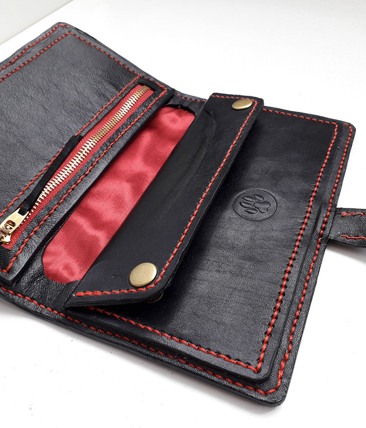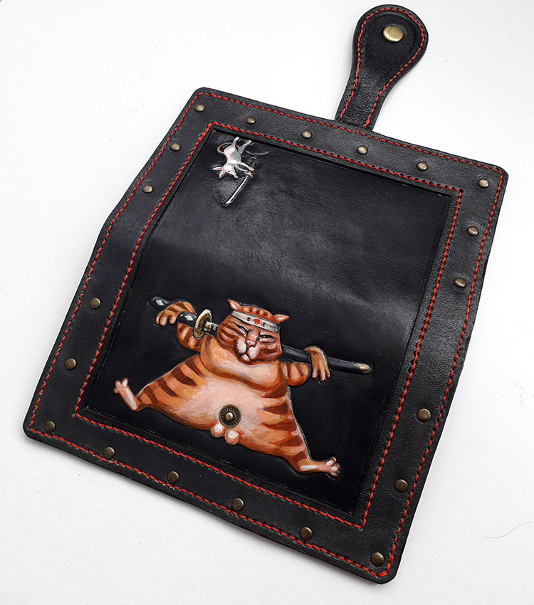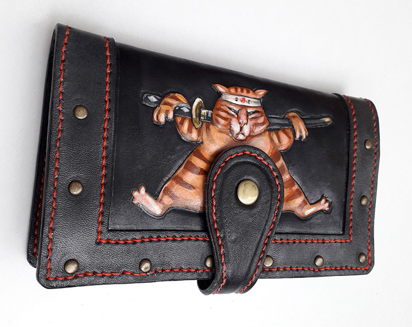 Продолжаю осваивать шитьё кожи. Хороший человек попросил сшить кошелек с котом "повышенной всратости" по сравнению с предыдущим КОШЕлёчики и с восточным акцентом.. Отдаю вам на суд этого котика. В силу того, что выкройку придумал сам, вылезло пару косяков в виде кривых швов. Бутерброд получился слишком толстый, да еще и клепки мешались. Планирую оптимизировать и упрощать конструкцию и не выпендриваться с лишними элементами.. да и уменьшать размеры надо. Кошель получился не карманный, а портфельный. Хотя, это на любителя. (Кожа "растишка" 1,6. Нитки 0,6. пробойник 0,4. Размеры аж 190х110мм..)