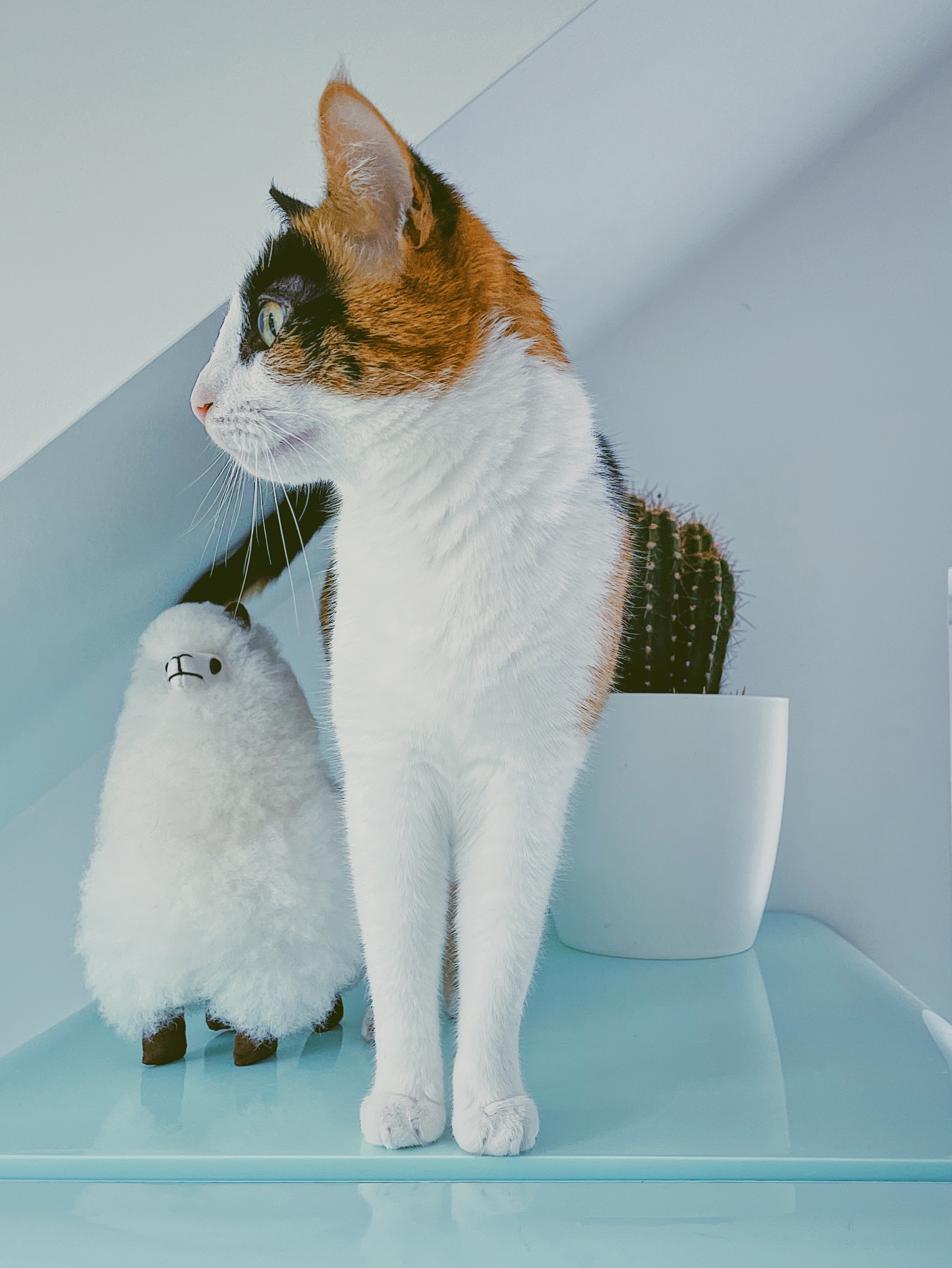 Редкий случай, когда ламу не скинули в тот же момент, как кошка забирается на холодильник. Кактус не трогает уже - слишком колючий.