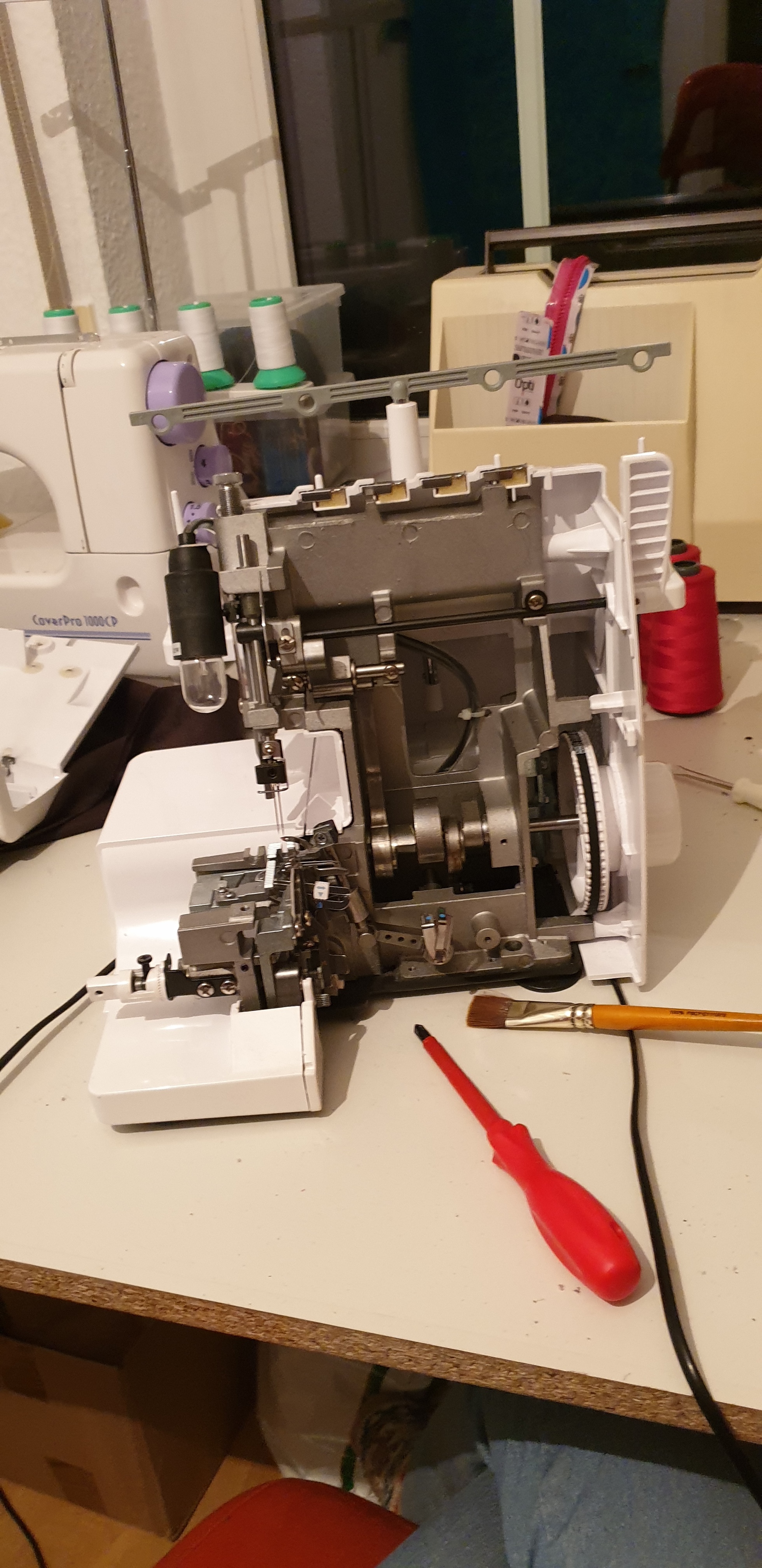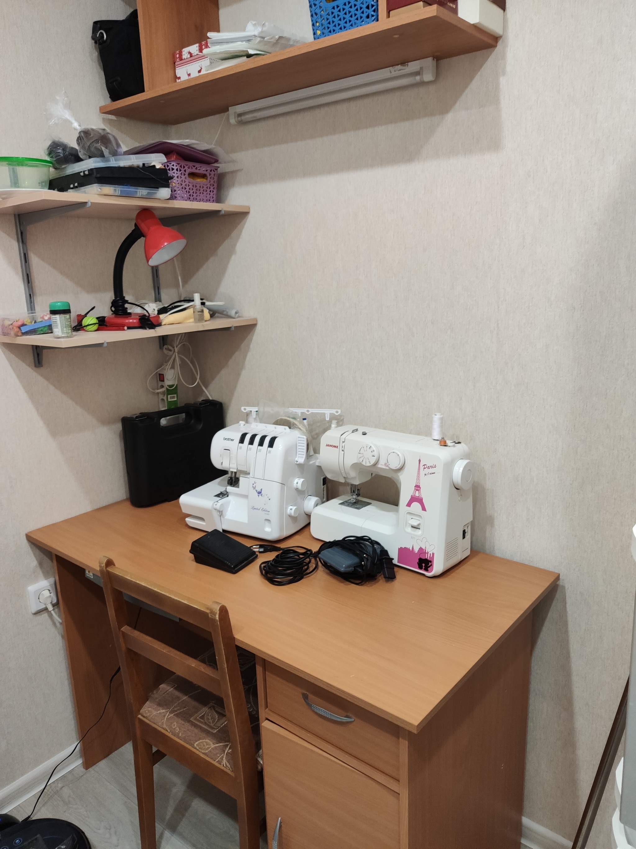 Уютно! Прям красота! У меня не стол, а просто доска лежит на каркасе от старого стола (досталось мне это все, когда фирма, где работал муж, выкидывала старую мебель из офиса^^). Край этой доски обклеен скотчем)) Не очень элегантное решение, но кроить норм)