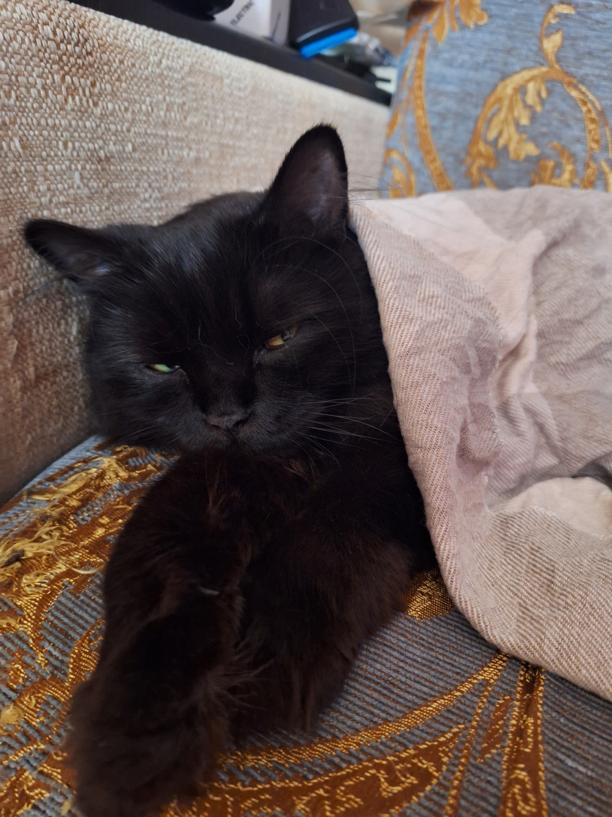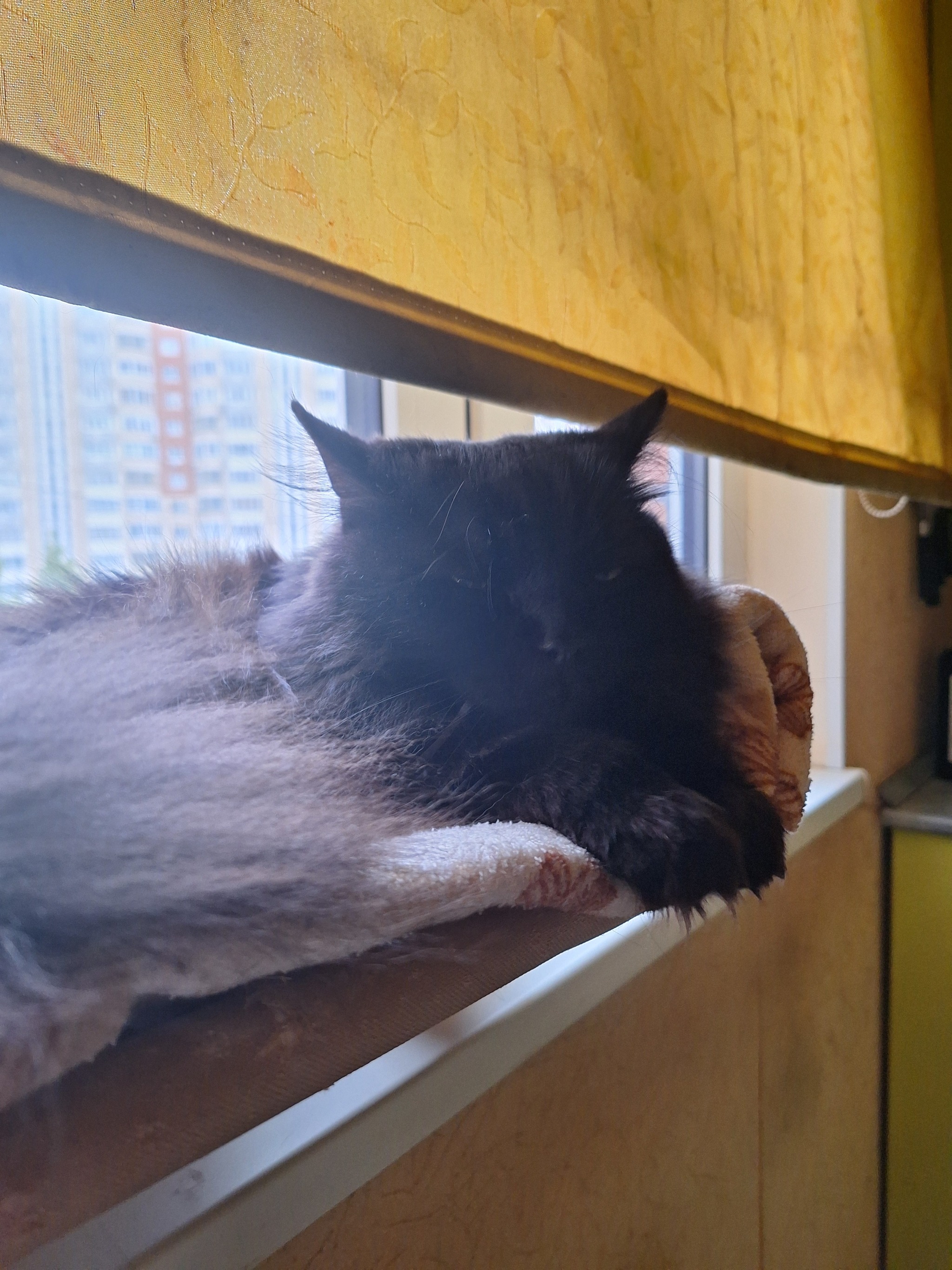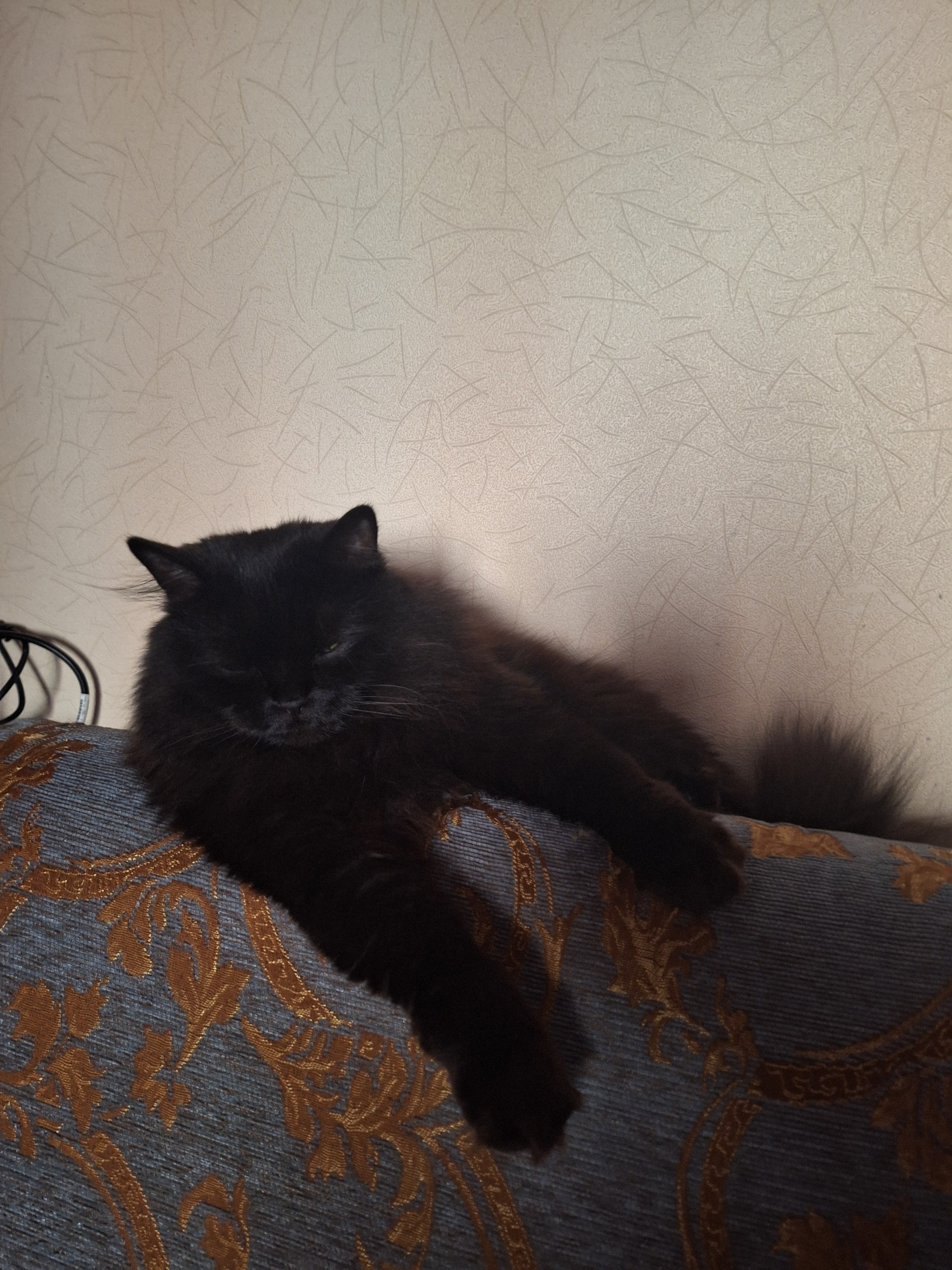Не родственники. Кот поступил к нам котёнком из подвала, кошка семь лет спустя из деревни, тоже котёнком.
