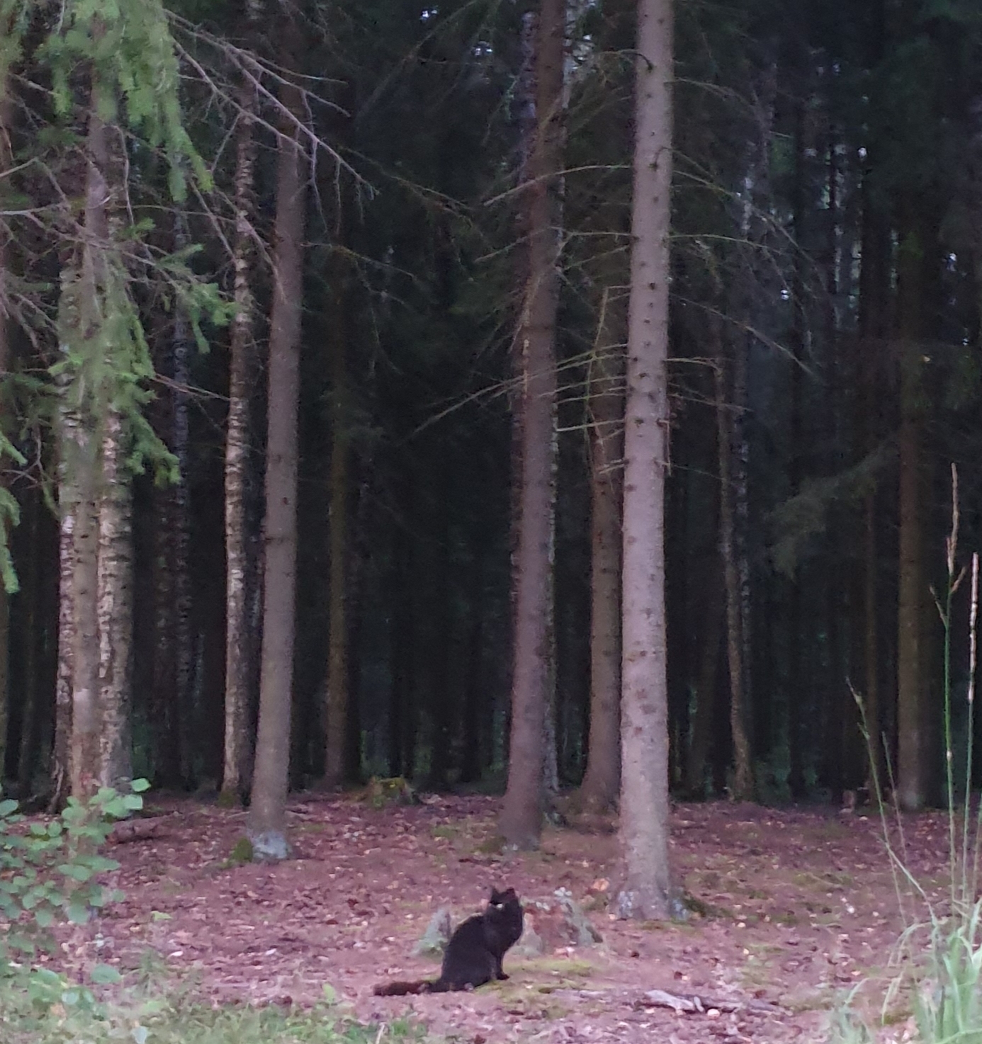 Ух ты, примерно так у нас и было. Лес один в один, разве что скалы и камни торчат местами. Но тоже зловеще. И котейка поменьше)) орал мерзко, иначе б не нашли.