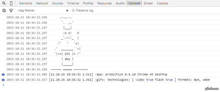 Tantacula 10 лет назад Кот-повар Может уже было, но если вы откроете консоль разработчика (f12 в хроме) на страницах пикабу вы увидите того, кто заправляет местной кухней. Пикабу F12