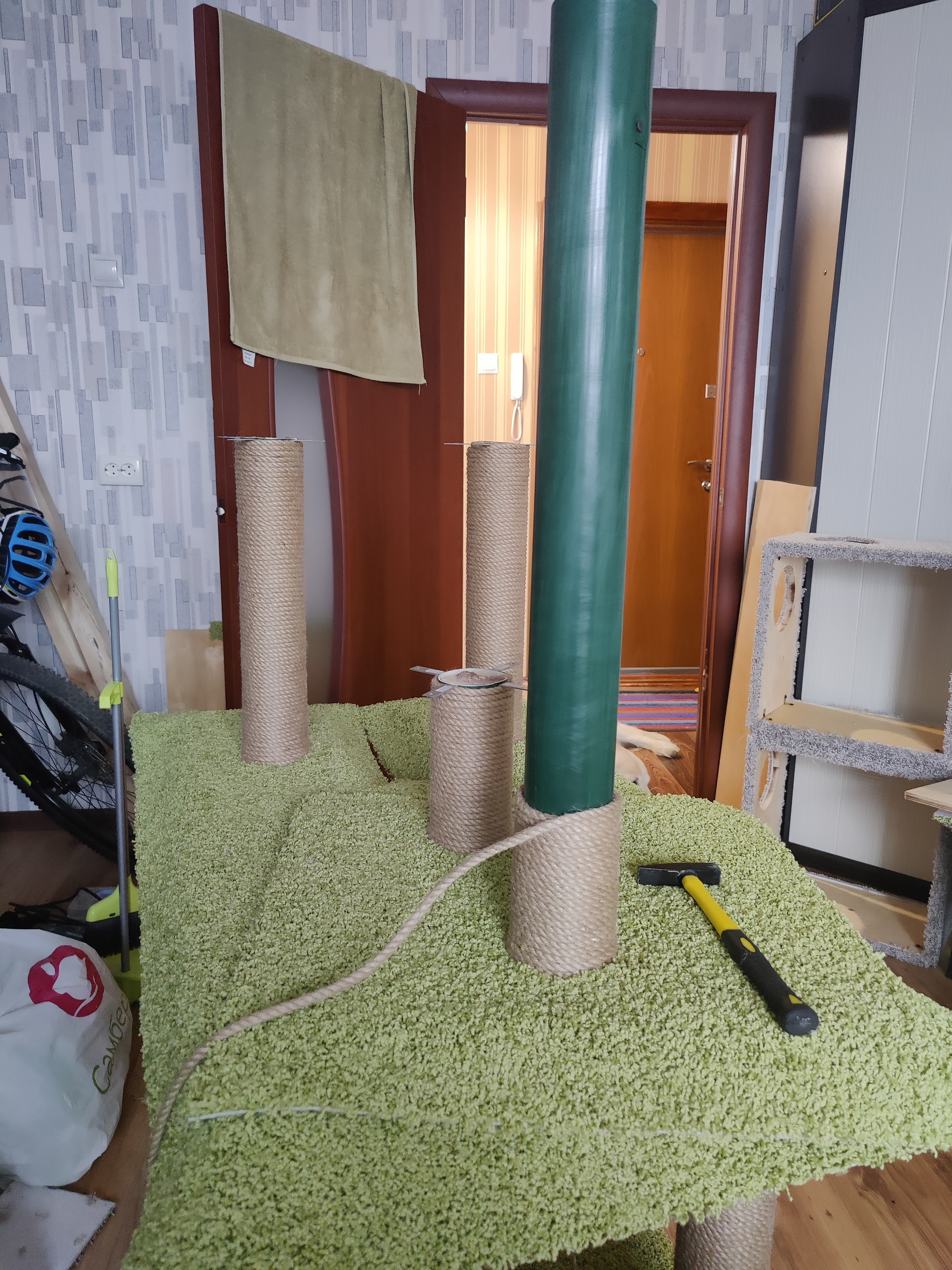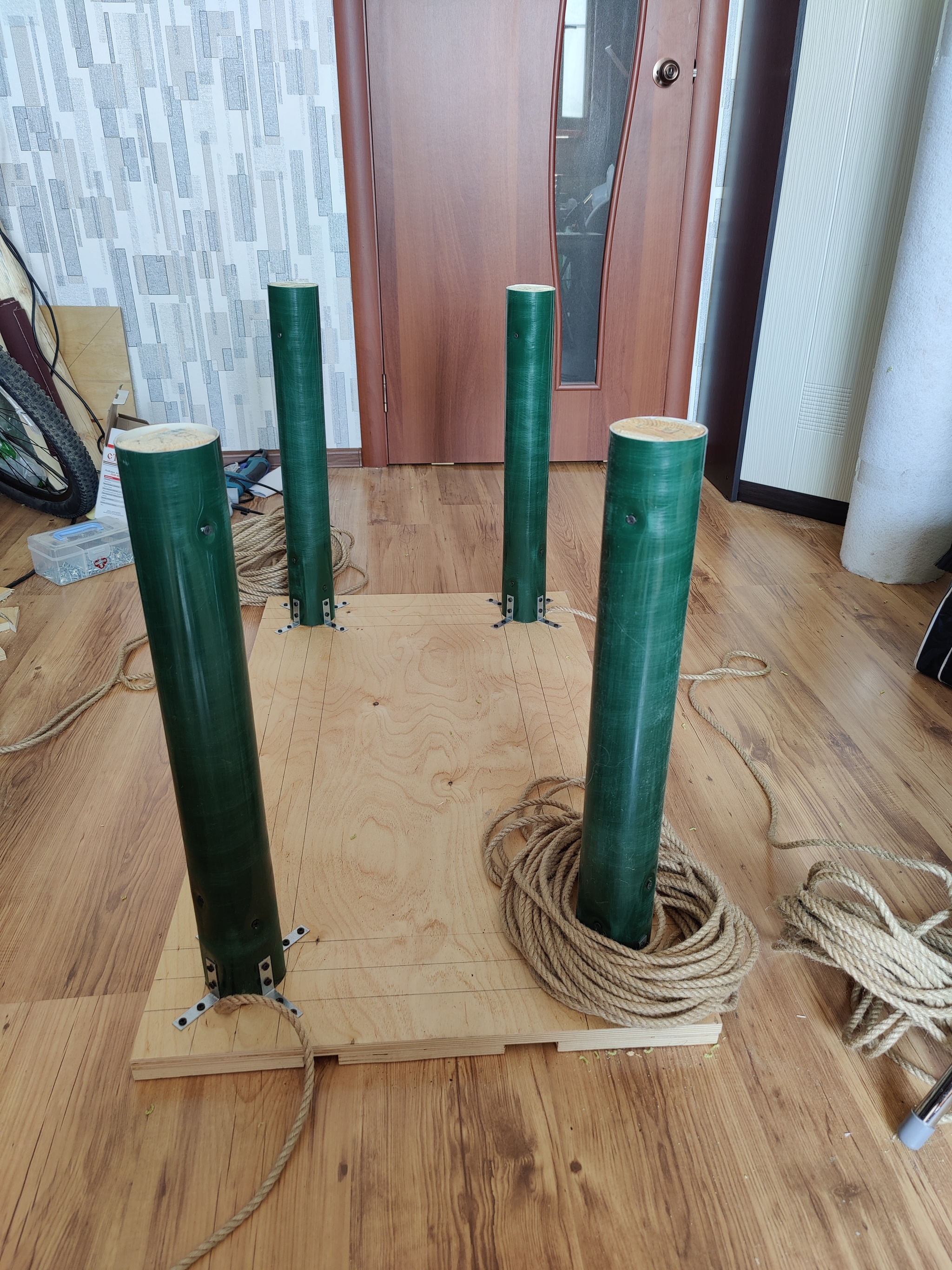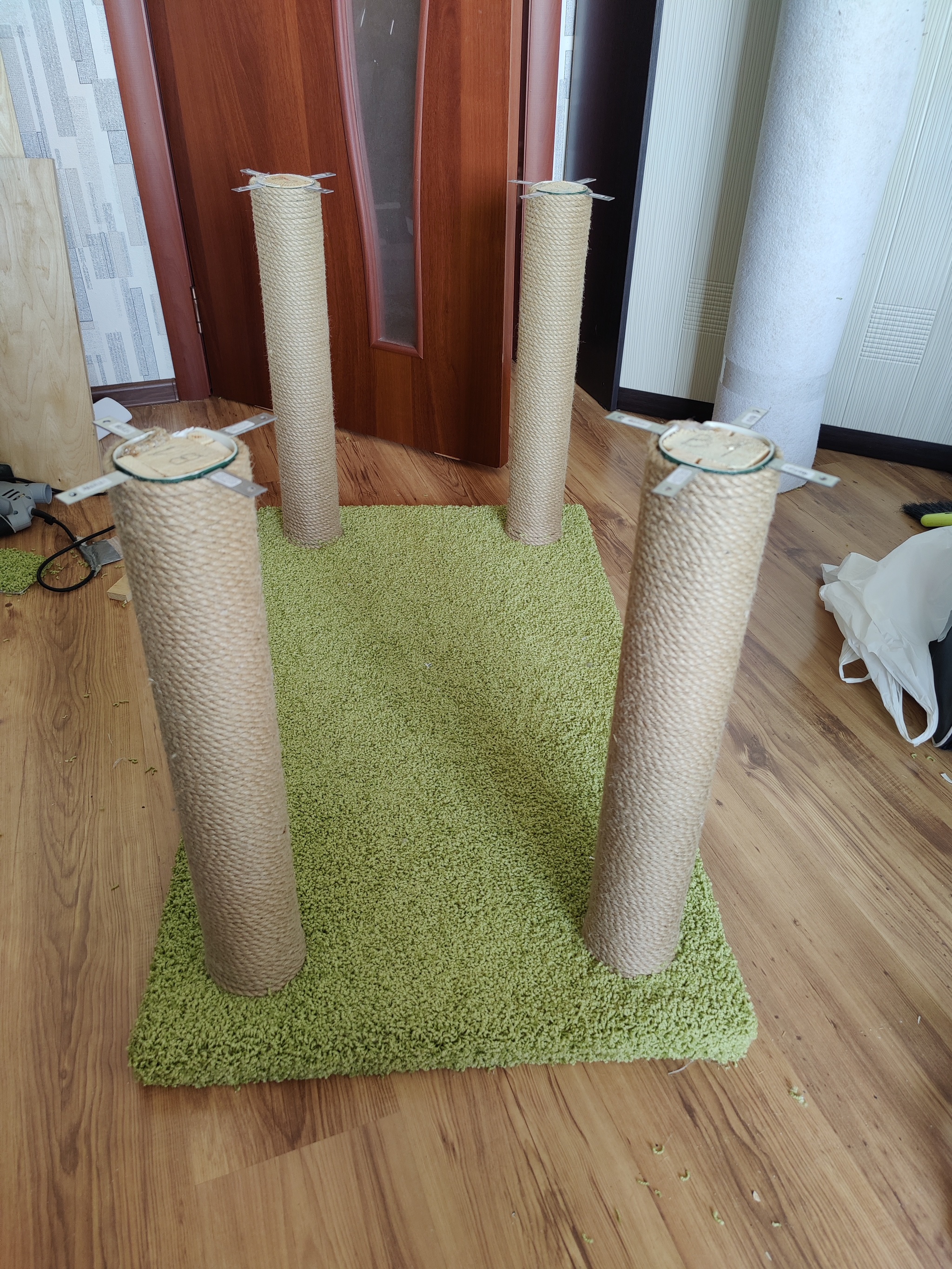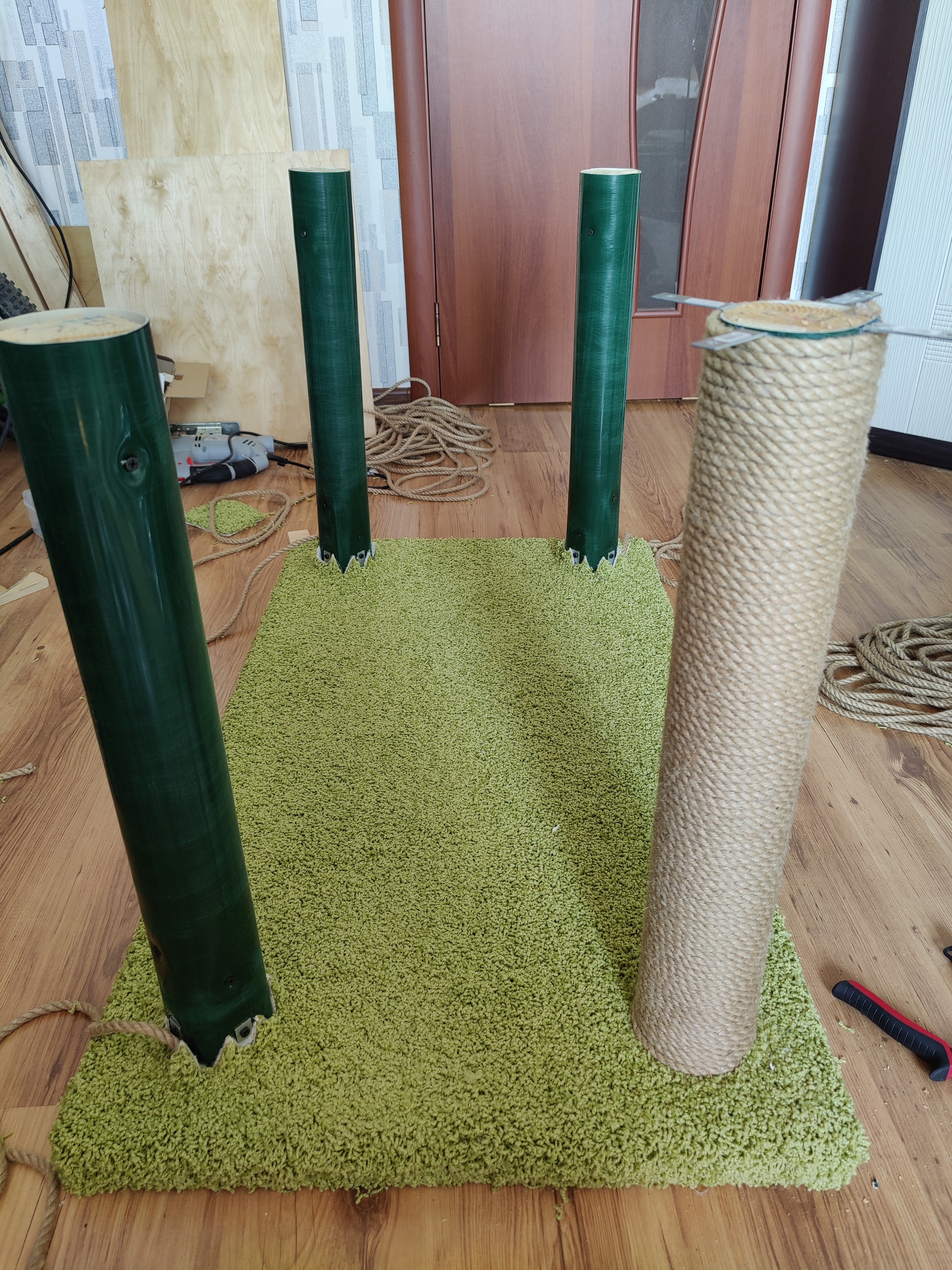 В Леруа закуплена и распилена фанера - 2 листа 1525х1525 15мм (не без ошибок и пришлось допиливать чутка дома), там же взял ковролин двух цветов (взял 8 квадратов, использовал примерно 6,5-7), трубы водосточные (они лёгкие и достаточно прочные, 82мм внешнего диаметра - в итоге получились довольно толстые столбики, но не тумбы, как если бы я взял канализационные трубы 110мм), бухту 8мм джутовой веревки. Брал с запасом на ещё одну простую когтеточку с верхней лежанкой. Брусок деревянный 70х50х3000 пришлось брать в другом месте, его использовал для заглушек на концах труб, чтобы обеспечить прочность и жесткость крепления. Брусков 60х60, которые в теории должны вписаться в трубы как родные, в наших магазинах в принципе нет, поэтому взял 70х50 - они с небольшой подрезкой углов тоже влезают хорошо.