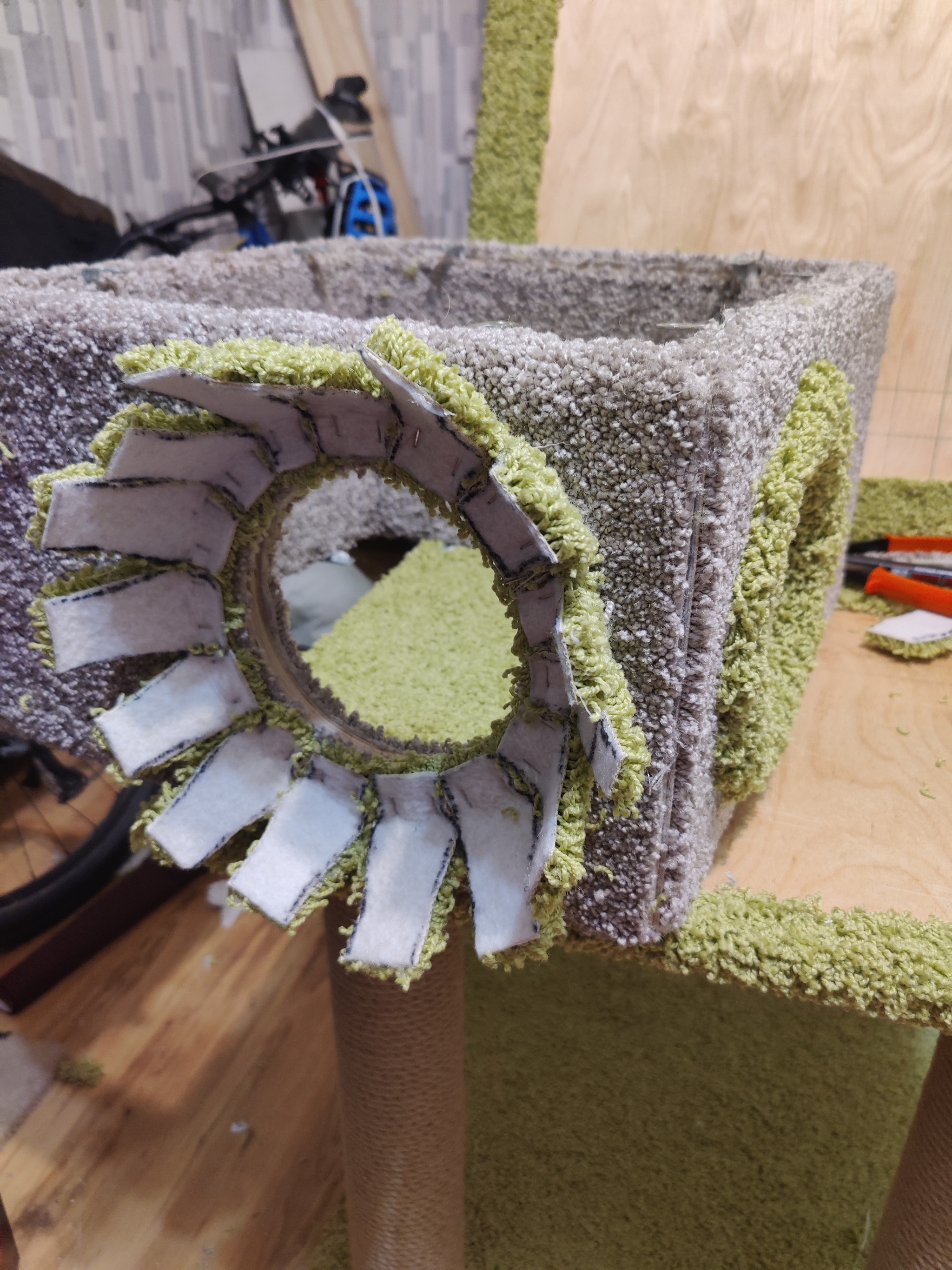 Ковролин крепил на клей и после заворота фиксировал скобами. Проблема вылезла при оформлении проемов. Оказалось, что изначальное решение сулит много неудобств и сложно реализуемо, поэтому пришлось колхозить что-то другое. Зато красиво получилось.