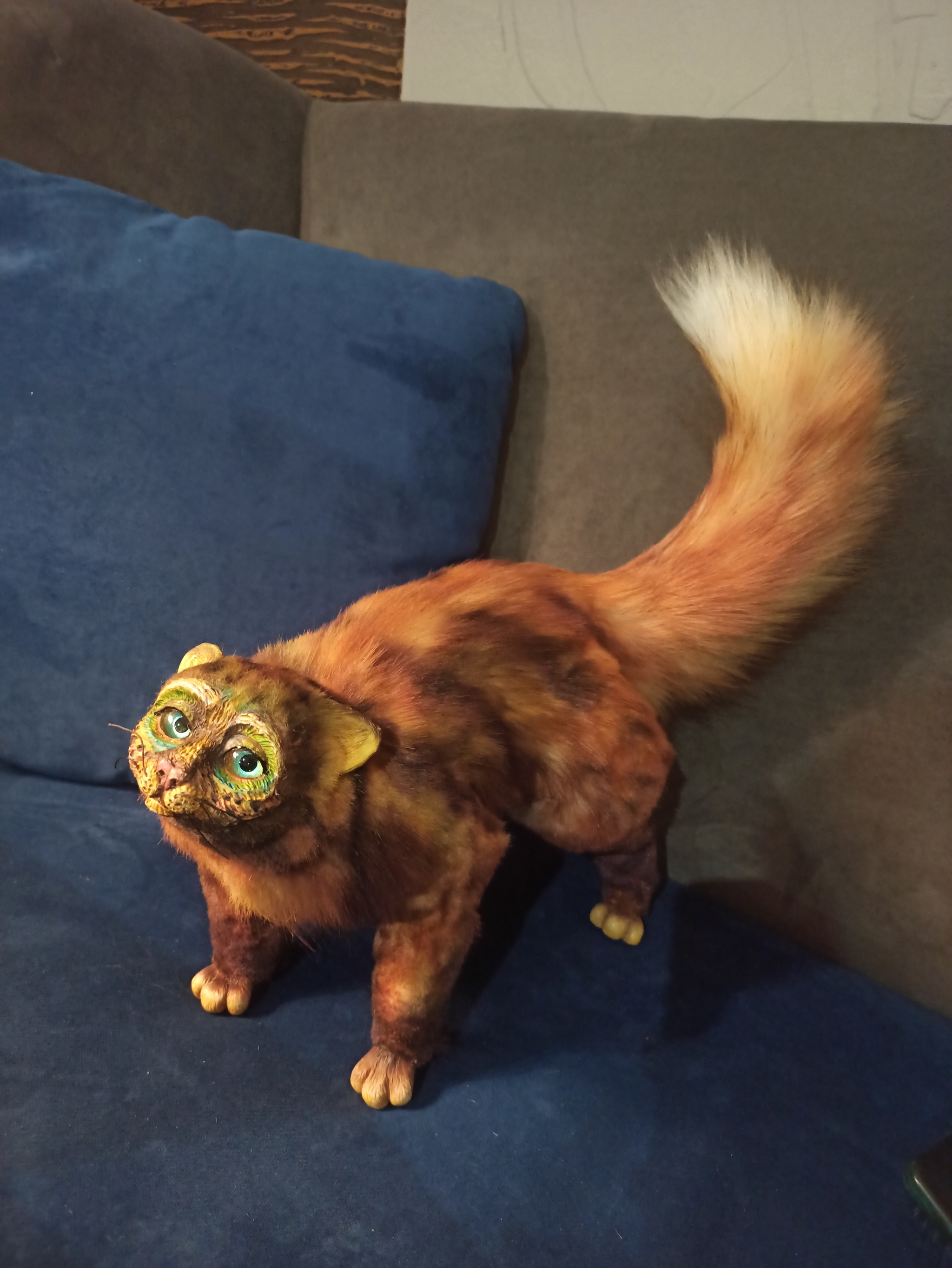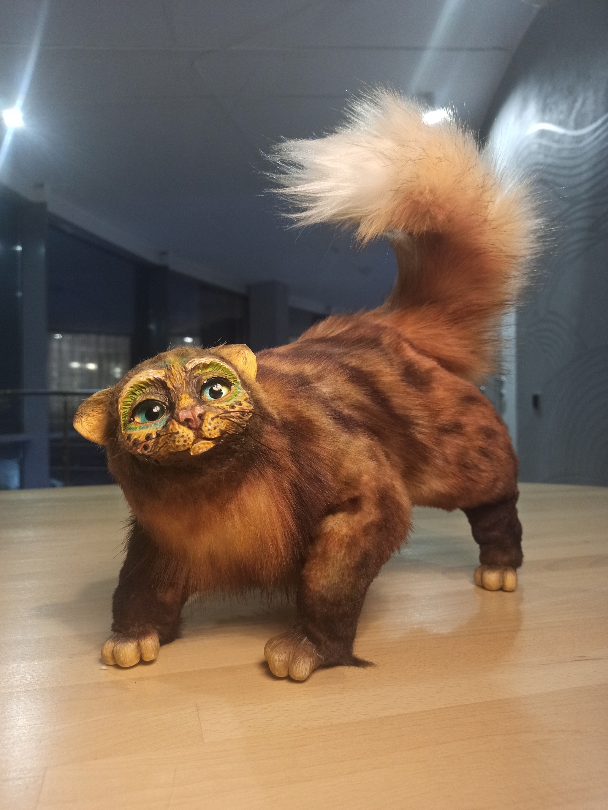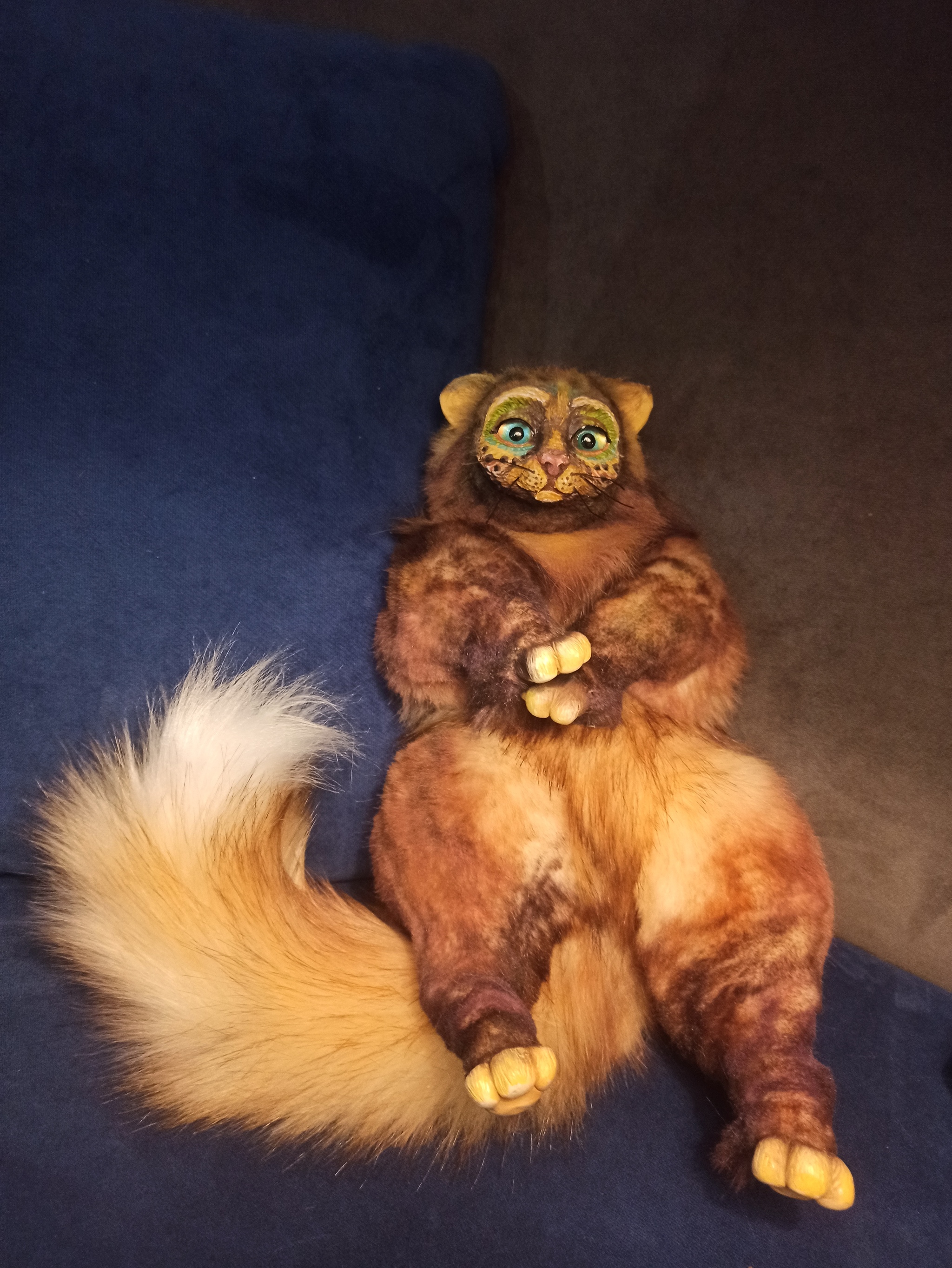 Сделала игрушку в смешанной технике, морда и лапки из полимерки, туловище из проволочного каркаса, синтепона и искусственного меха. Всё окрашено акрилом, полимерные части покрыты соответствующим лаком.
