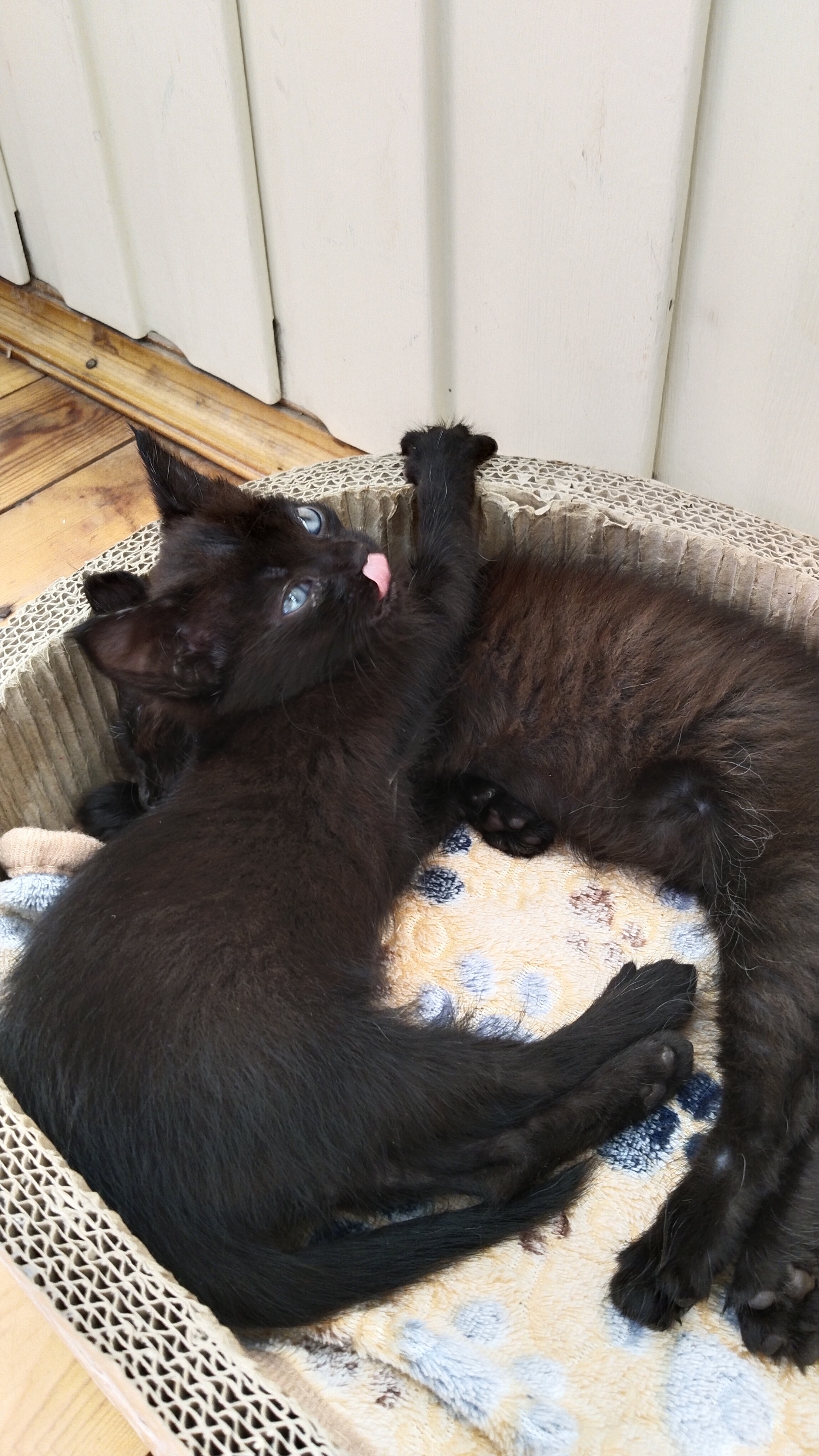 Спасла их от стаи собак, примерно 2-3 месяца, всё уже самостоятельно. Кушают сами, аппетит великолепный)) В лоток пошли сами сразу, очень умные ребята. К рукам хорошо, мурлычят громко) Активные, игривые, будут лучшими друзьями. От паразитов обработала.