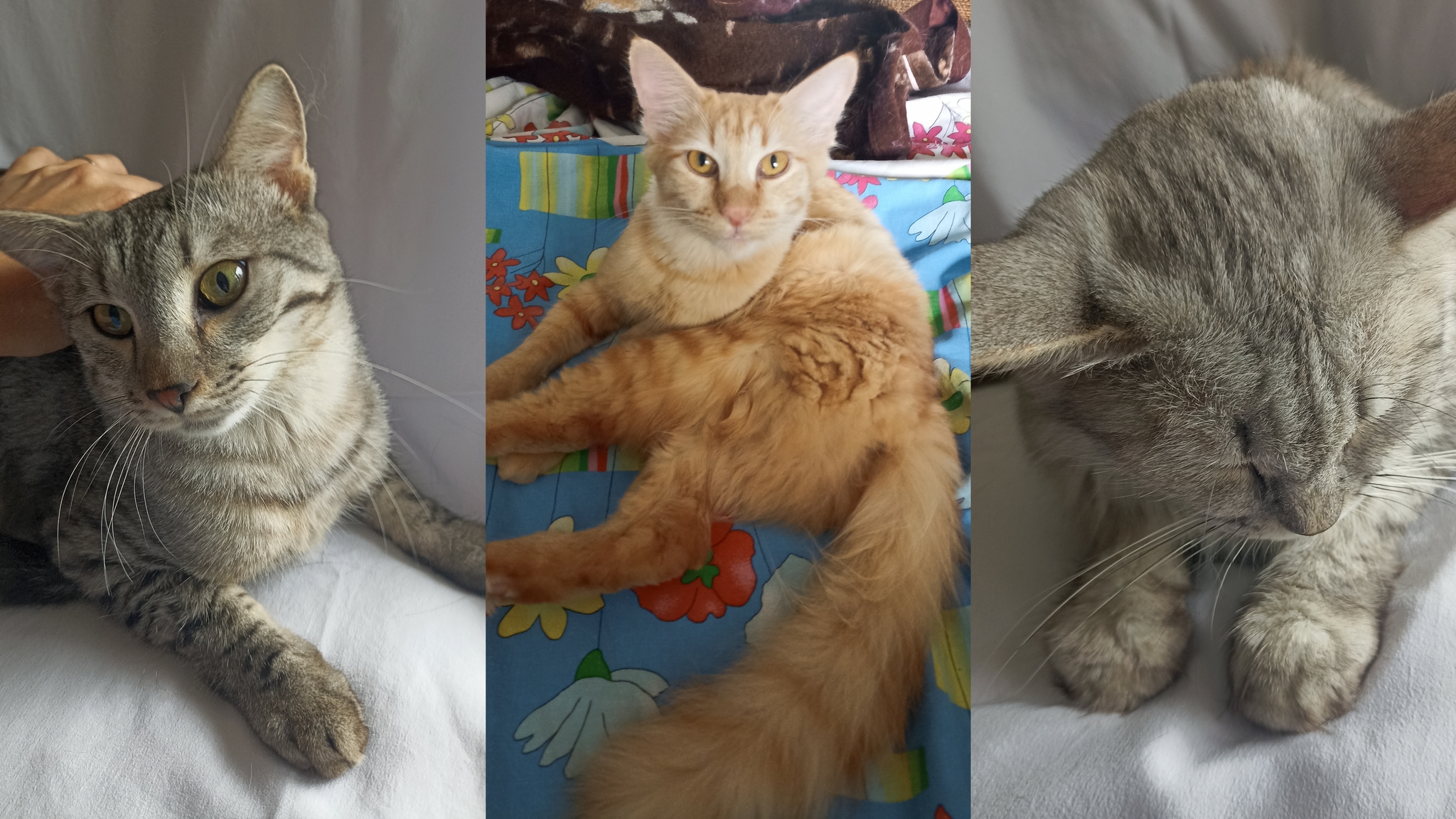 2 мальчика скоро год, Рыжий и Серый, кастрированные. По характеру разные, активные. Лапы и туловище вытянутые, как у ориенталов. Игривые. Чистые. Едят хорошо, не наглеют, в туалет по расписанию в лоток. И их мать миниатюрная очень. Спокойная, ласковая, флегматичная слегка. Такая лапочка. В хорошие руки отдаем, у бабушки 7 котов, а она в 84 года уже не справляется. Котишки бравые😽 что делать не знаем