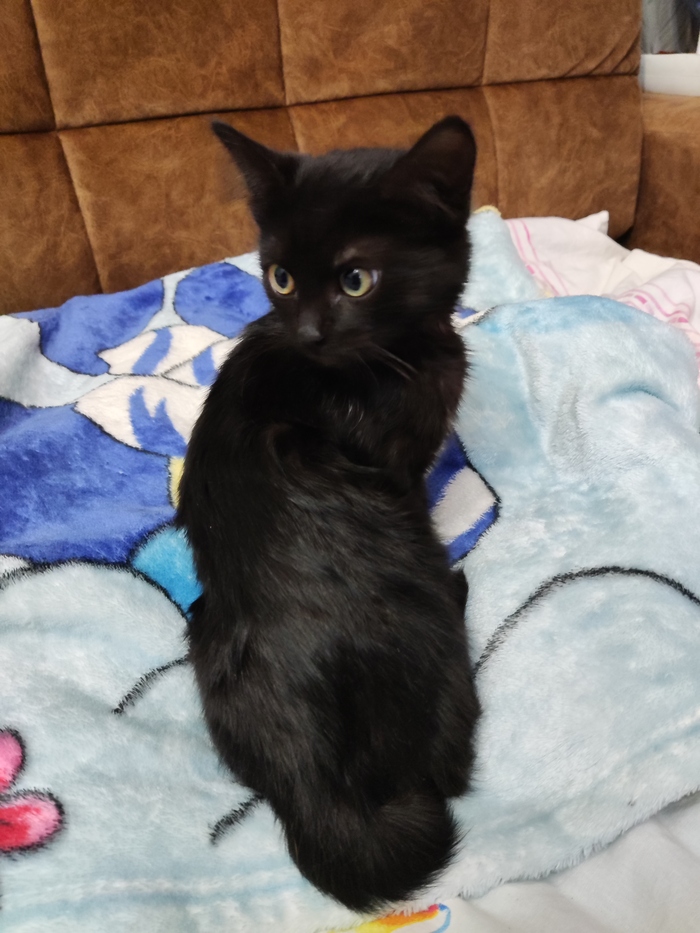 г. Щёлково. В ночь с 22 июня на 23 кто то подбросил котёнка на заправку Газпрома на ул. Талсинская. Услышала громкое мяуканье в 00.30 аж на 11 этаже. Спустилась, котёнок сильно плакал, но в руки не давался. Только днём мальчишки смогли словить. Это оказалась очень худенькая маленькая девочка 2-х месяцев ( но фото выглядит больше, чем есть). Показала ветеринару - есть рана на бороде ( не лишай). Сделали имунный укол и дали глистогонку. Дома , помыла, от блох обработаю. Муж дал неделю на пристрой 🥺🤦♀️. Прошу помощи в поисках ручек. Девочка очень ласковая, мурчит когда прижмется/пригреется, но ещё очень боится и может шипеть. Сейчас ночь, она плачет, наверное маму зовёт, на руках успокаивается. Хвост или был сломан или такая родилась, глазки немного косят.