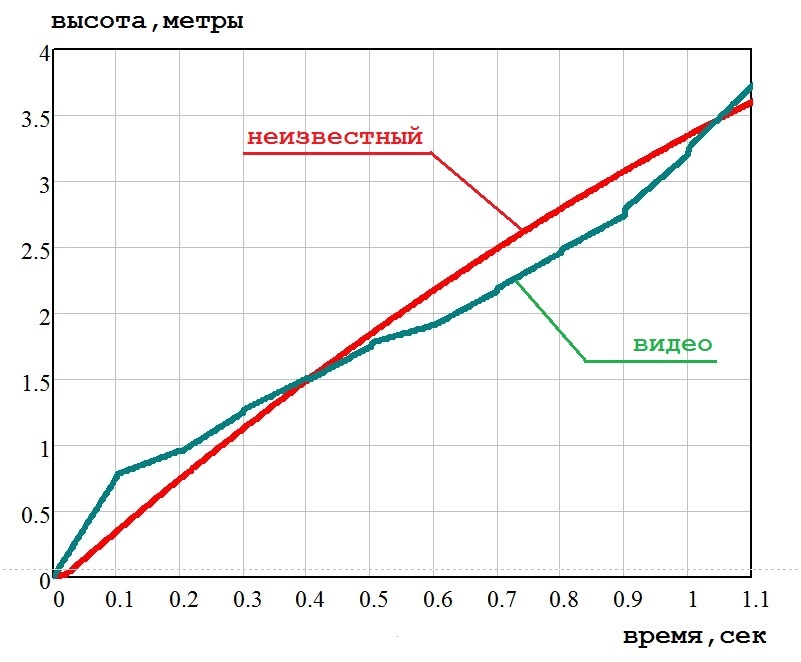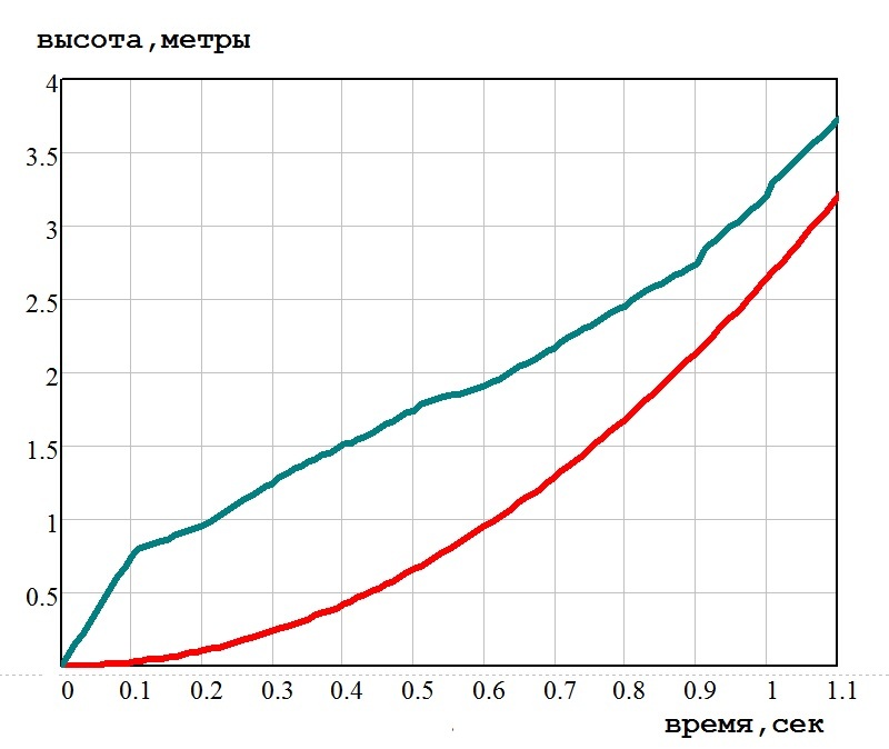 В итоге у нас появилась зависимость высоты подъема модуля от времени. Чуть ниже мы его представим читателю, а сейчас немного слов о второй зависимости, которая будет представлена там же. Поскольку НАСА представила все исходные данные по взлетному модулю Аполлона-17, то в первую секунду после старта с поверхности Луны достоверно определяется траектория его полета. Исходные данные: взлетная масса - 4977 кг, тяга двигателя - 34,3 кН, время работы двигателя - 400 сек, ускорение свободного падения на Луне - 1,62 м/сек2, старт вертикально, аэродинамическое сопротивление отсутствует. Вот эти две полученные зависимости и представлены вместе на рисунке 4.