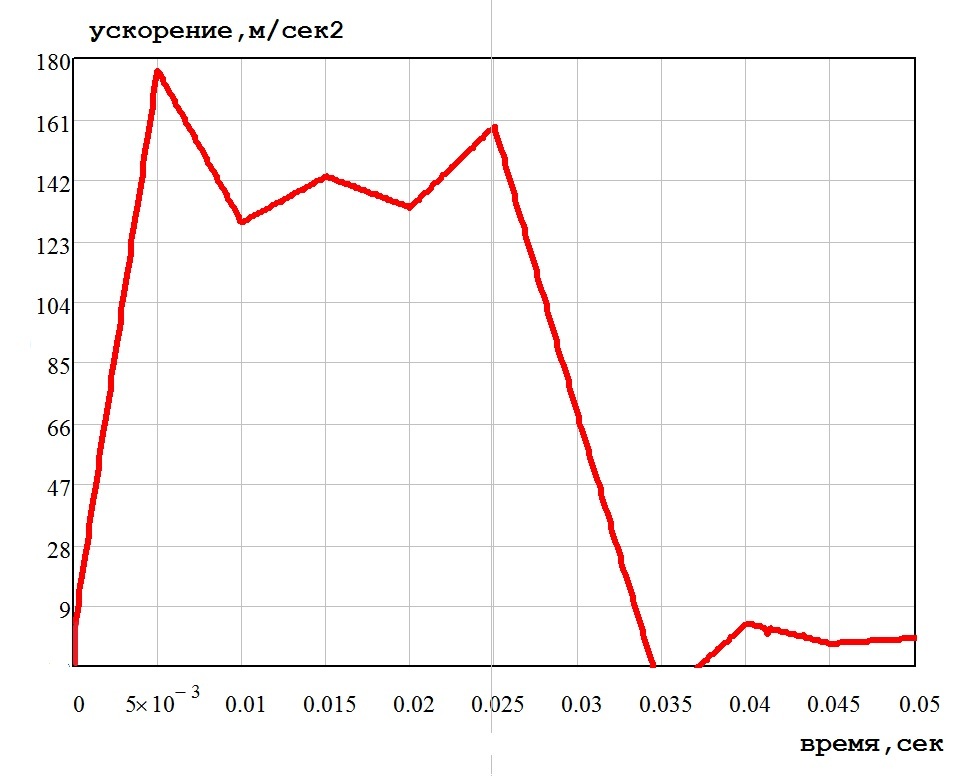 Но самое интересное для нас заключается в том чрезвычайно малом промежутке времени, пока работал этот взрывной двигатель. Используя предыдущий расчет, строим график ускорения взлетного модуля Аполлона-17 с этим двигателем, смотрим рисунок 6.