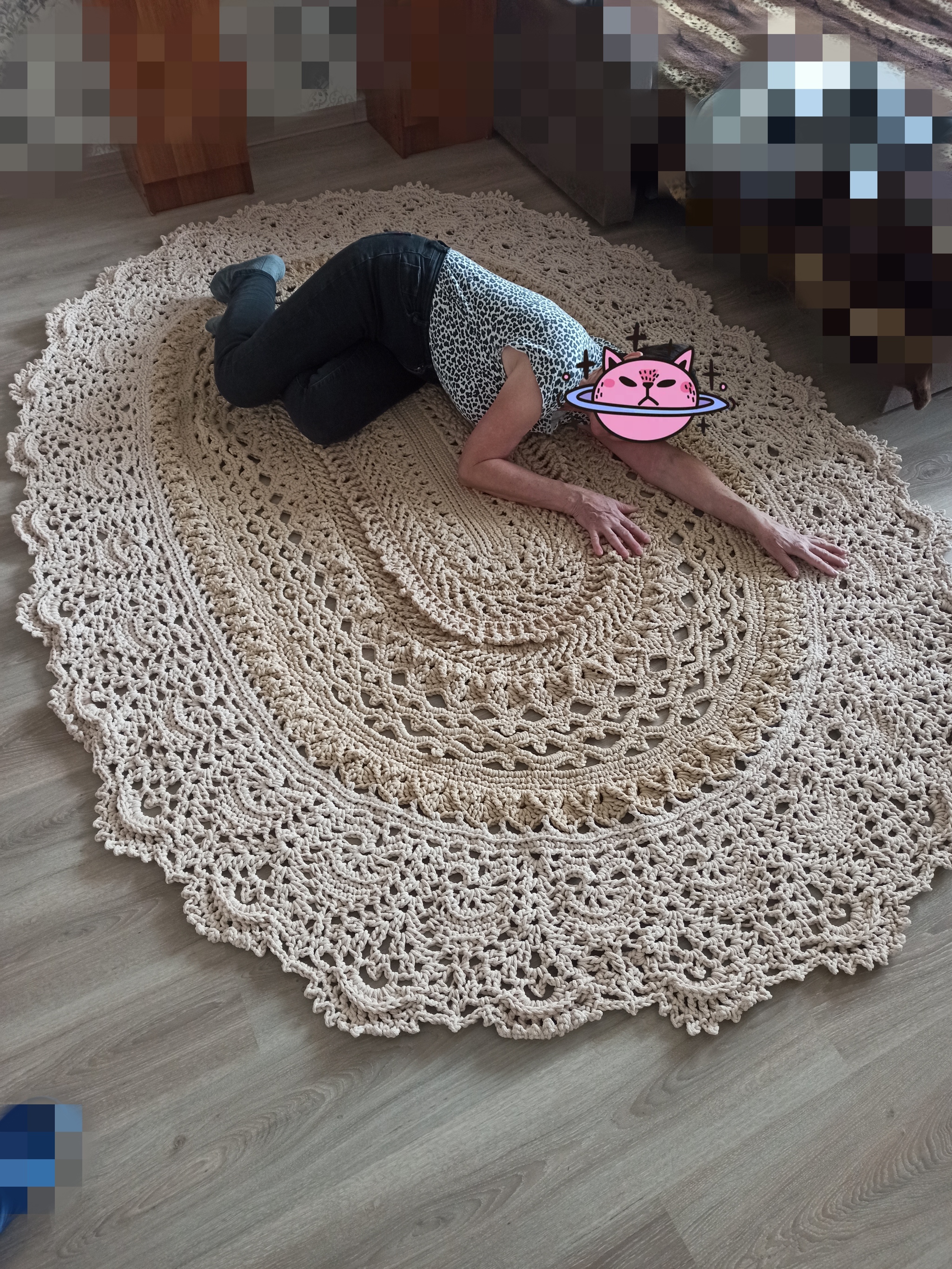 Шнур 5 мм с сердечником (12 по 200м) + крючок 6 = 3 месяца по вечерам после работы. Размер 200 см на 220см. Дополню: рисунок 3d для массажа стоп, делала в первый раз и не на продажу (для Мамы).