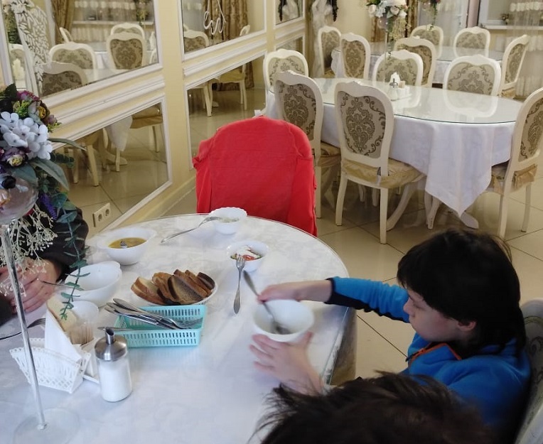 Удача нам улыбнулась в виде гостевого дома «Козельск», где в роскошной обстановке нас накормили таким вкусным и сытным комплексным обедом, что осталось еще и на ужин.