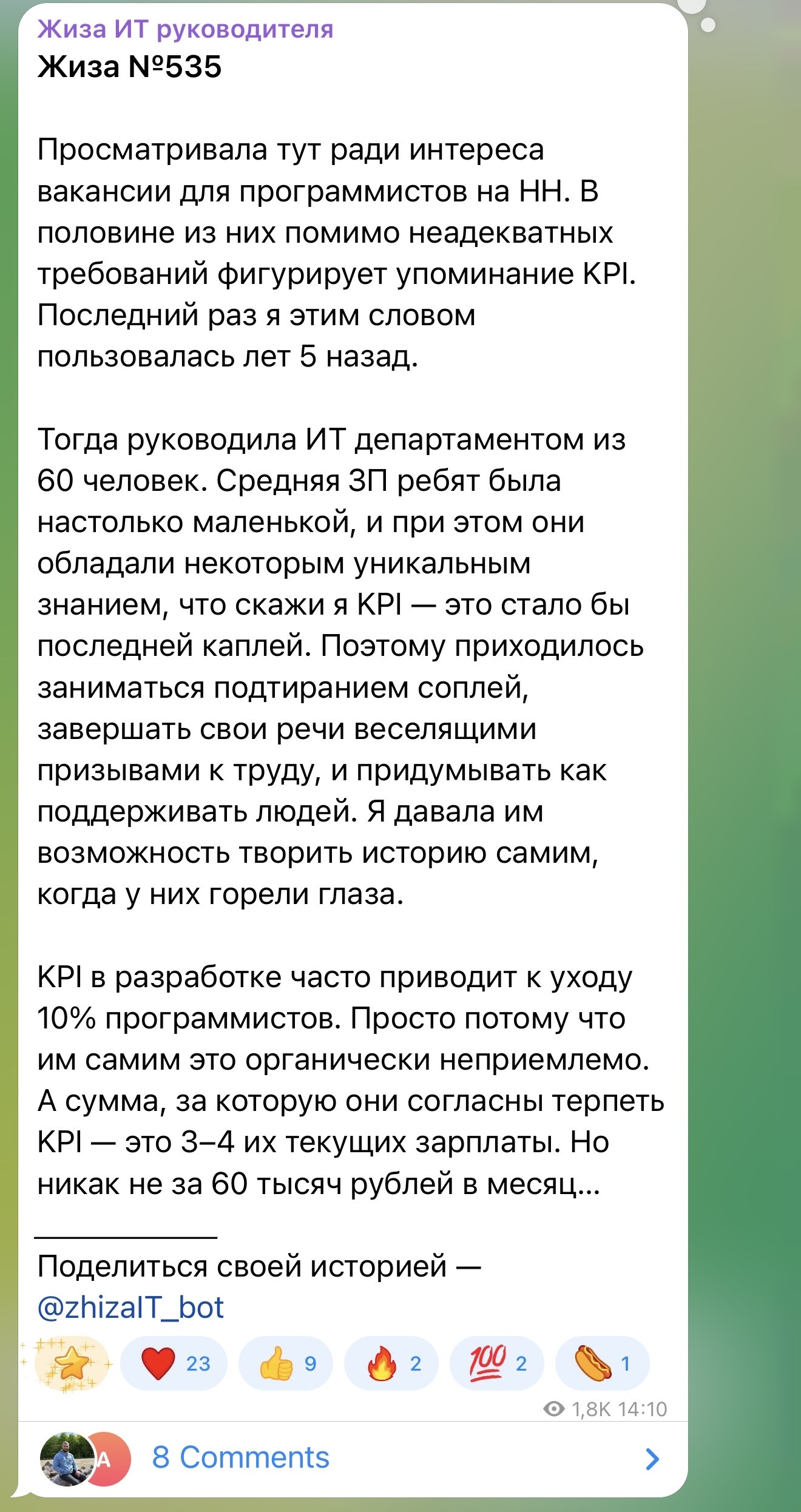 12 zhizait KPI в разработке 1 месяц назад Источник: «Жиза ИТ руководителя» IT Работа Истории из жизни Разработка KPI Менеджер Программист Telegram (ссылка) Скриншот 2 Ещё 0