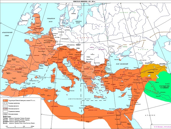 Один из последних путевых императоров который начал крупные политические реформы в империи. Он прекрасно понимал что времена меняются солнце уже не так ярко светит, трава не такая зеленая,армия уже не торт(об армии нужно создавать отдельный пост, тема очень длинная).Главным новшеством в административной системе было введение тетрархии. Суть тетрархии в том что император назначал четырех соправителей, а территория империи делилась на четыре так сказать округа империи.На запад и на восток отправлялись соправители, а центр занял сам император. Также Диоклетиан взялся и за реформу императорской власти.
