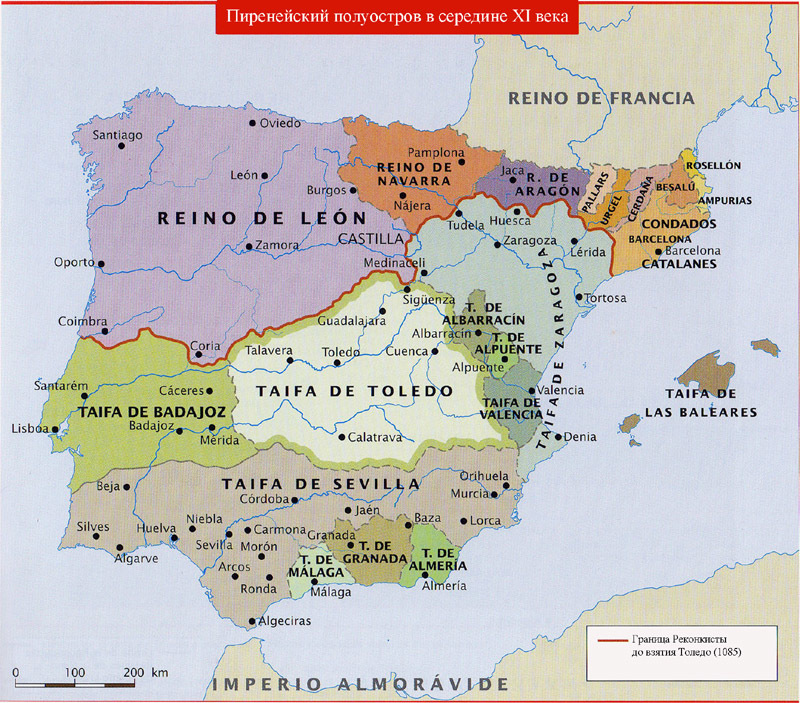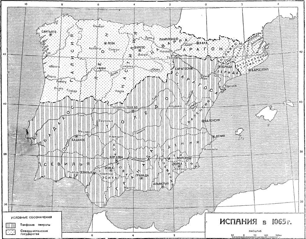 Из этих эмиратов достаточно будет упомянуть в качестве наиболее важных следующие: Кордовский, Севильский (эта территория вначале имела республиканское управление, а затем—монархическое); Малагский, в котором правил род Хаммудитов; Гранадский; Альмерлйский; эмират Дении и Балеарских островов, знаменитый своим флотом и корсарскими набегами на острова Средиземного моря и берега Италии; Сарагосский, которым правил аристократический род Бени-Худов; Толедский и Бадахосский. Титулы эмиров присвоили себе главным образом «славянские» и берберские военачальники; первым принадлежали восточные территории (Альмерля, Дения и др.), вторым—южные и западные (Малага, Гранада, Бадахос, а также Толедо). Таифские эмиры вели между собой постоянные войны. Если некоторые эмиры, как, например, Дении и Бадахоса, не вмешивались в эту борьбу, то тем не менее они ощущали на себе последствия конфликтов, которые разгорались между государями юга, особенно между Гранадой, Малагой и Севильей. Стремление этих эмиров заключалось в том, чтобы стать халифами и объединить под своим скипетром все мусульманские территории. В середине XI в. было четыре государя, одновременно носившие этот титул.