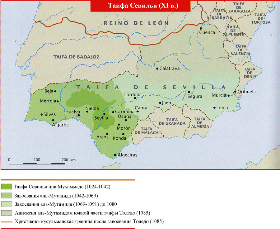 Обеспечив свое преобладание в успешных войнах, аль-Мутадид решил что наступил момент, когда можно обойтись и без лжехалифа, и заявил,, что Хишам III умер и в своем завещании назначил его эмиром всей арабской. Испании. Сын аль-Мутадида, аль-Мутамид, вступивший на престол в 1069 г. в еще большей степени обеспечил преобладание Севильи, завоевав Кор¬дову (на которую претендовал также эмир Толедский) и мурсийский эмират. Таким образом, большая часть арабской Испании принадлежала теперь Аббадитам, за исключением эмиратов Севера и Востока (Сарагосы, Альбар-расина, Валенсии, Дении, Альпуэнте) и эмиратов Альмерии, Толедо, Гранады, Малаги и Бадахоса и нескольких других незначительных княжеств, сохранявших свою независимость. Мутамид—одновременно воин и человек большой культуры—был покровителем науки и литературы и оставил о себе память как замечательный поэт. Он превратил Севилью (при поддержке своего не менее знаменитого хаджиба Абен Амара) в выдающийся центр культуры, ни в чем не уступавший Кордове эпохи ее расцвета.