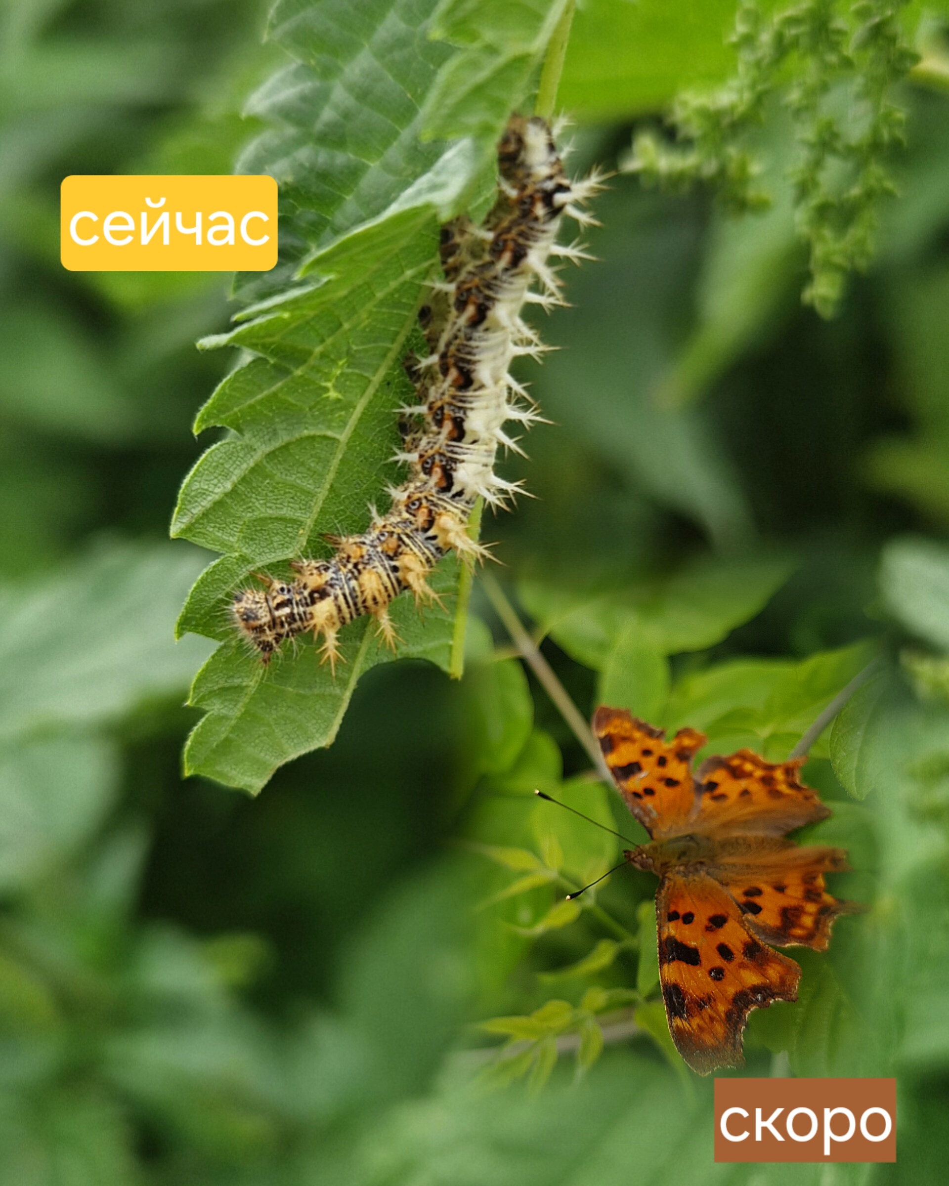 Вот встретилась на листьях крапивы гусеница как-бы двойной окраски: половина верха белая, половина рыжая. Маскируется под птичий помет и живет открыто, не опасаясь быть замеченной и склеванной. Мне всегда кажется, что колючки из съеденной крапивы как-будто проросли у неё на теле. Такая дополнительная защита. Это гусеница бабочки-нимфалиды углокрыльницы с-белое.