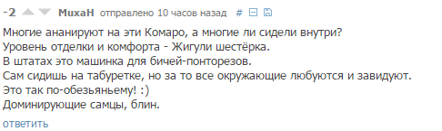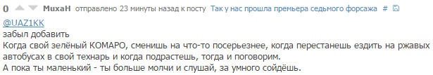 @MuxaH, Уважаемый, на глупенького как раз вы похожи. Меньше выёбывайтесь. И да, убегать, хлопая дверью не красиво. Я вас не оскорблял и не унижал. А вы прост добавили в ЧС, аргументируя свою т.з. "Тачка - говно для альфачей"