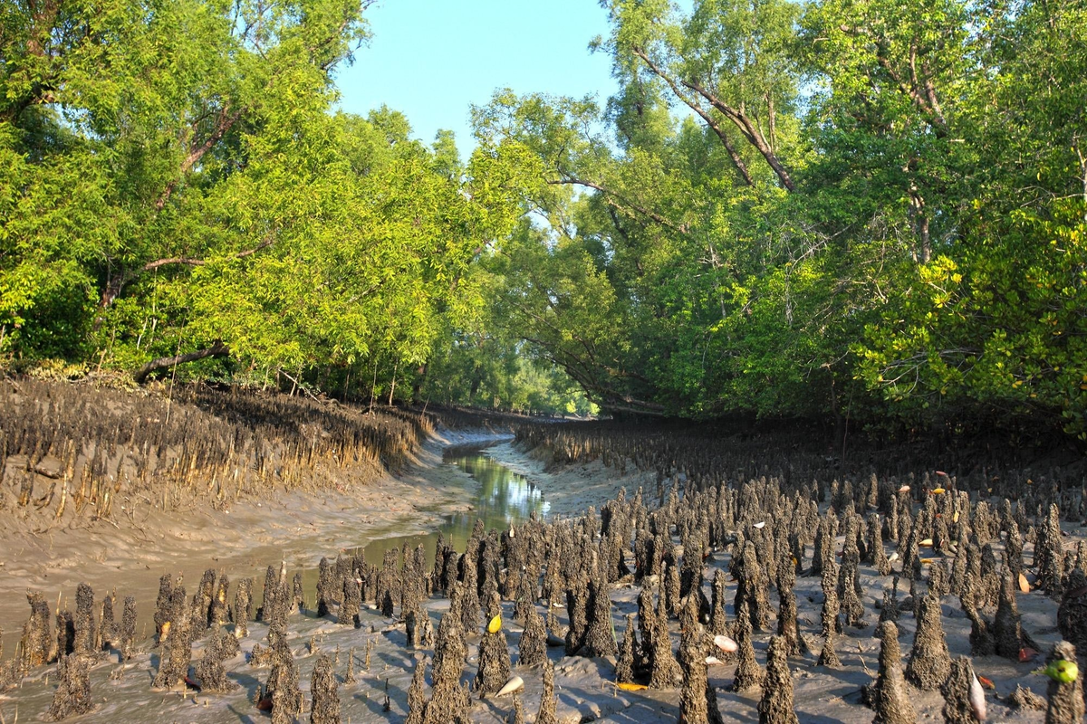 На территории Сундарбана постоянно взаимодействуют пресные и соленые воды, а ландшафт состоит из многочисленных протоков, островов и илистых отмелей. Влажность воздуха здесь может достигать 80 %, а среднегодовое количество осадков – 1500-2000 миллиметров. Климат муссонный: период дождей длится с июня по октябрь, а сухой сезон – с ноября по май. Среди мангровых видов Сундарбана доминирует Heritiera fomes из семейства Мальвовые. Дерево известно как «сундри» – по одной из версий, отсюда и название массива (по другой версии, Сундарбан переводится как «красивые джунгли / красивый лес»). Напомним, что особенно интересны адаптационные механизмы мангровых деревьев, включая развитие пневматофоров – специализированных воздушных корней, позволяющих растениям существовать в условиях кислородного дефицита заболоченных почв.