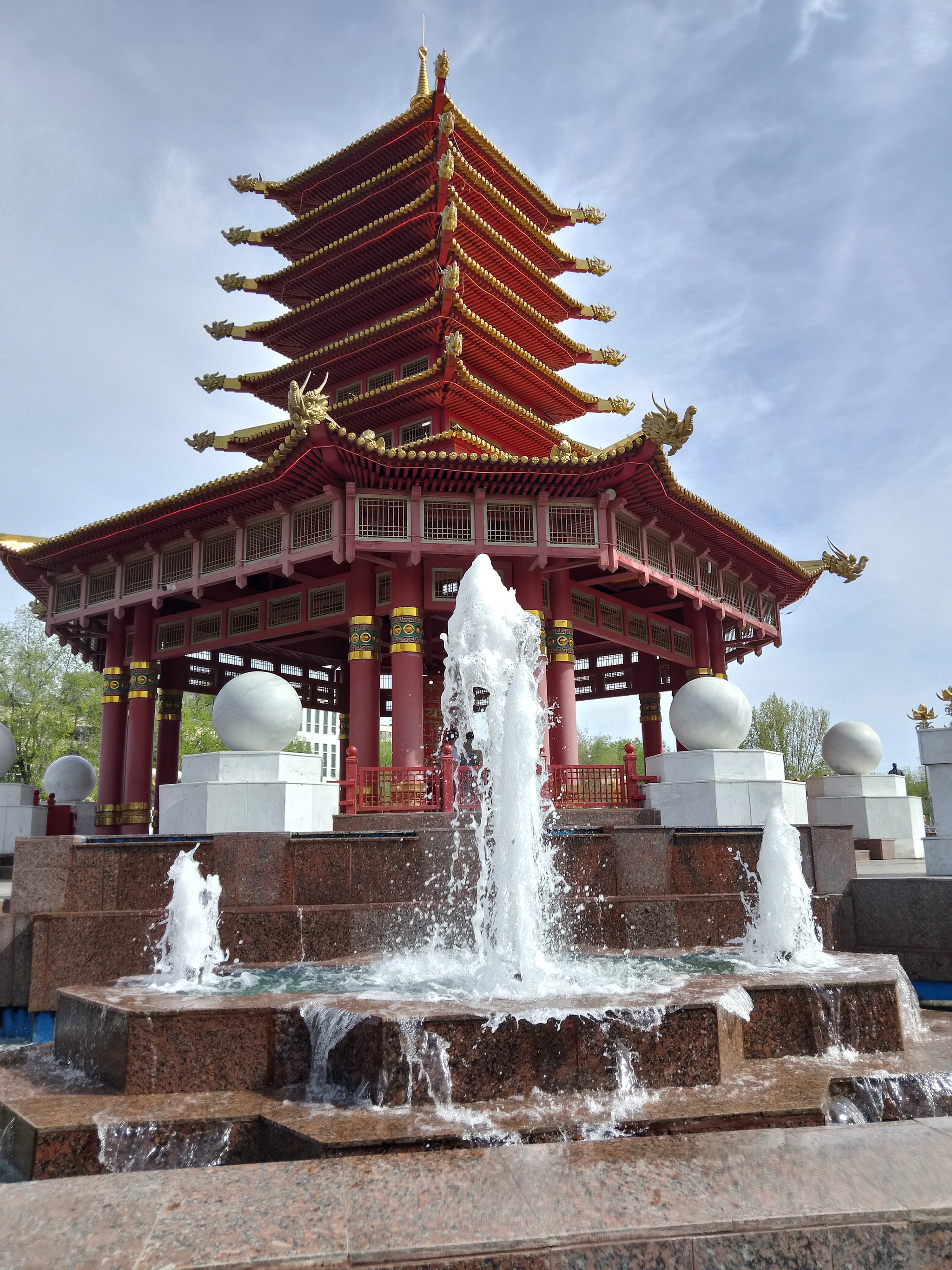 За брызгами (струей?) фонтана не виден молитвенный барабан в центре Пагоды. Барабан весит 2 тонны, на нём нанесены золотыми буквами надписи мантры «Ом мани падме хум» на тибетском языке, санскрите и калмыцком языке. В барабан заложены 75 миллионов мантр. Прокрутил один раз барабан (лучше три или другое нечётное раз) - как 75 миллионов раз молитву во благо всех живых существ прочитал.