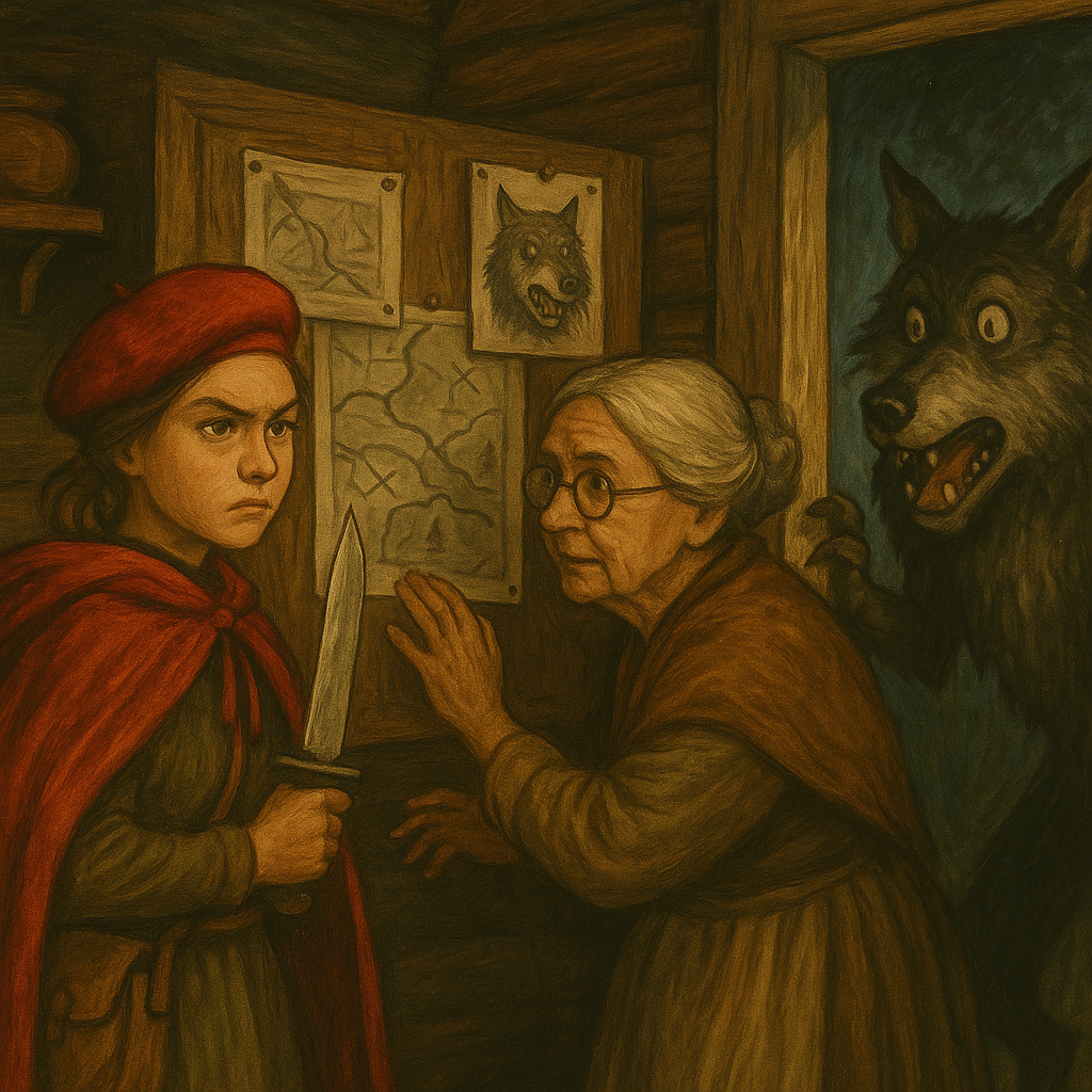 У Красной Шапочки была корзинка с пирожками, но это был лишь фасад. Настоящий вес тянули верёвка, компас и потрёпанная карта с красными отметками. На голове — красный берет.