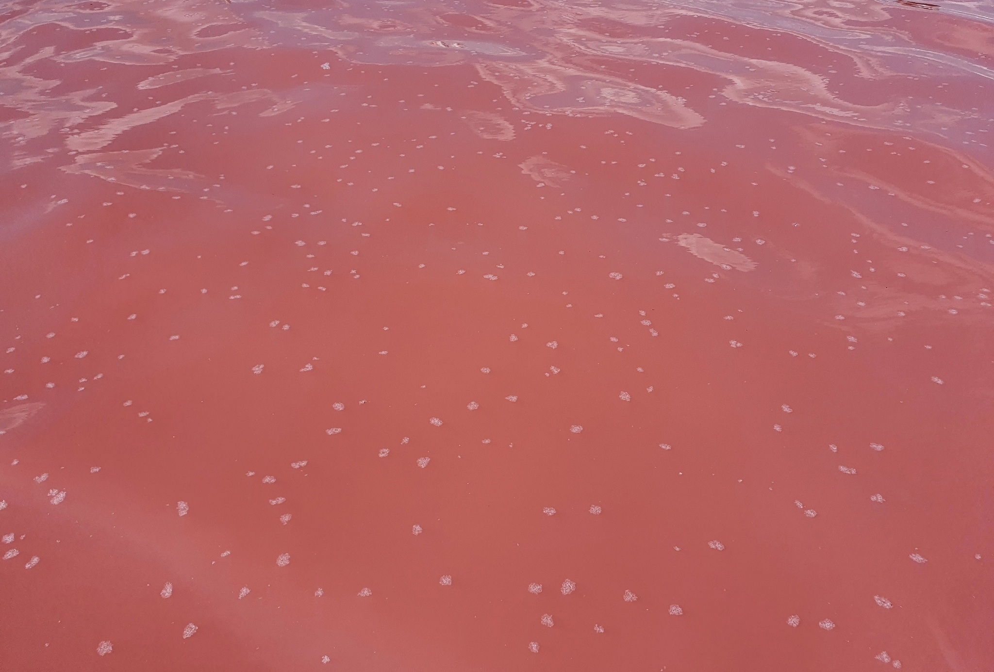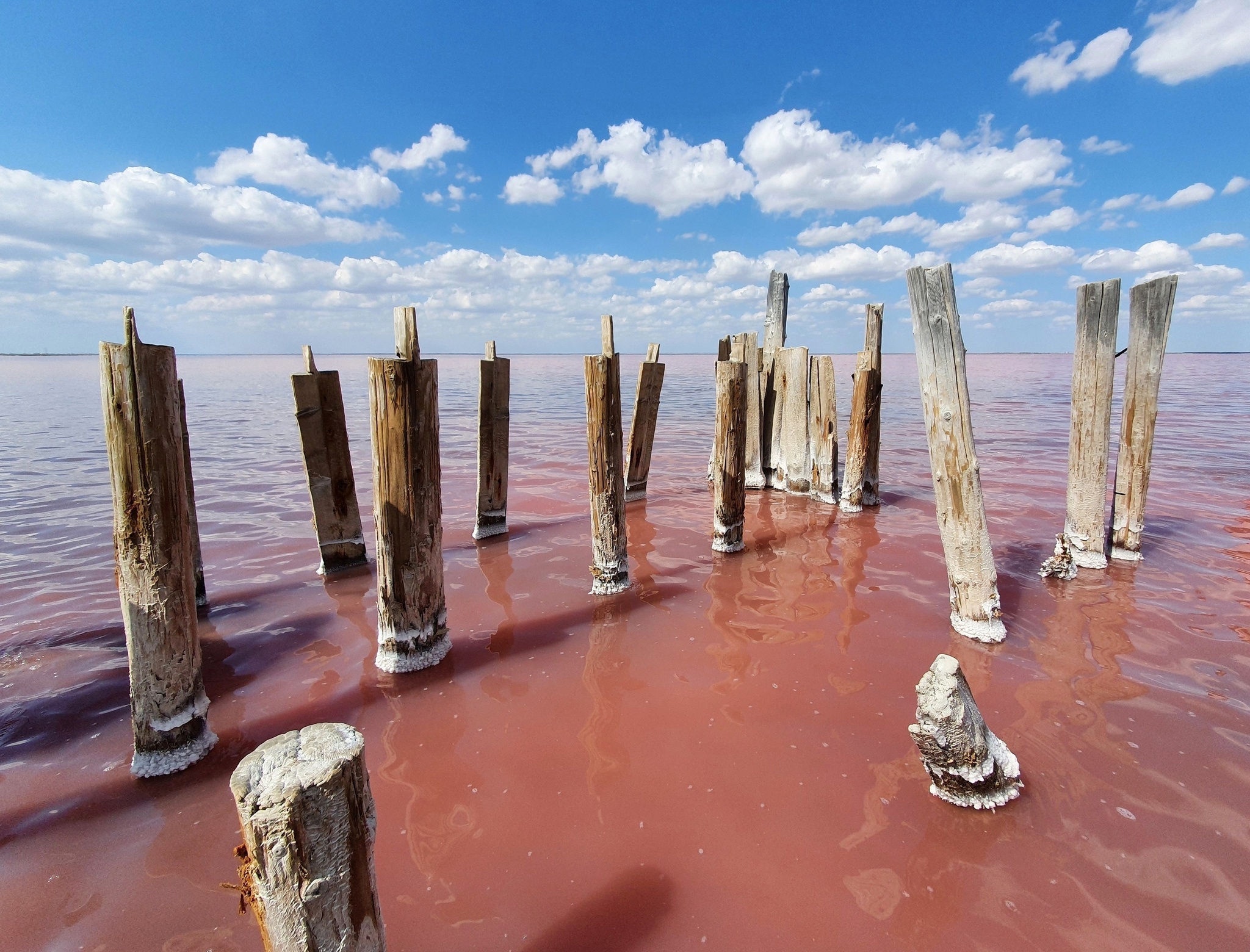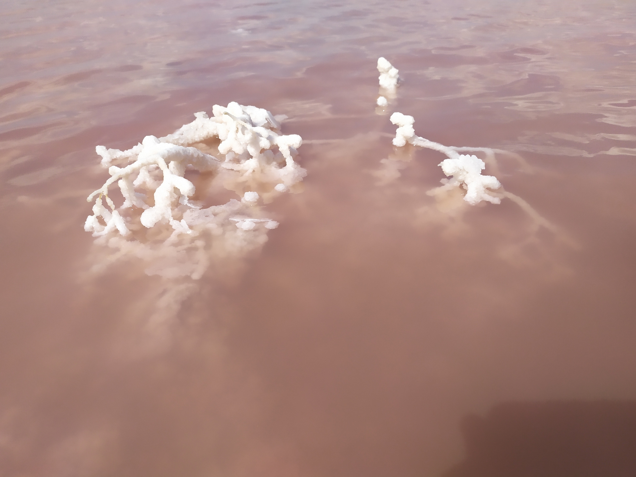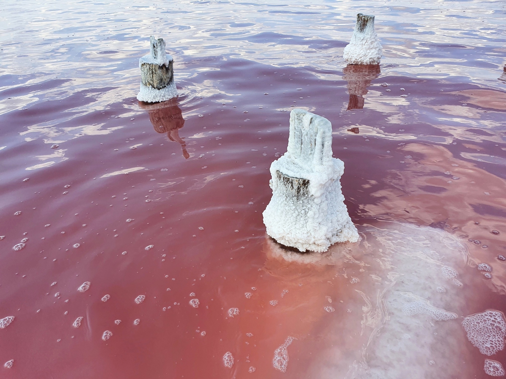 Оно скорее розовое. И то, на закате и при определённом освещении. Несколько недель всего. Там живут особые колонии водорослей, которые "цветут", именно из-за них озеро и приобретает такой цвет.
