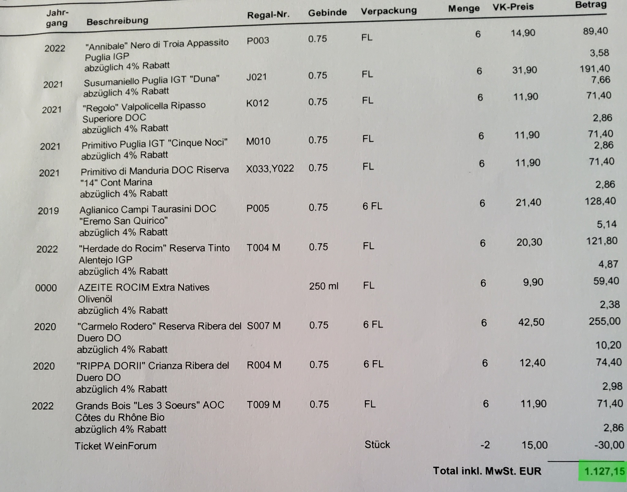 Первый раз счет на вино превысил тысячу евро. На винной выставке. Получили 2 бутылки игристого в подарок. "Это на Новый год!" (UPD. все как-то неверно понимают - на Новый год только игристое, вино на каждый день!)