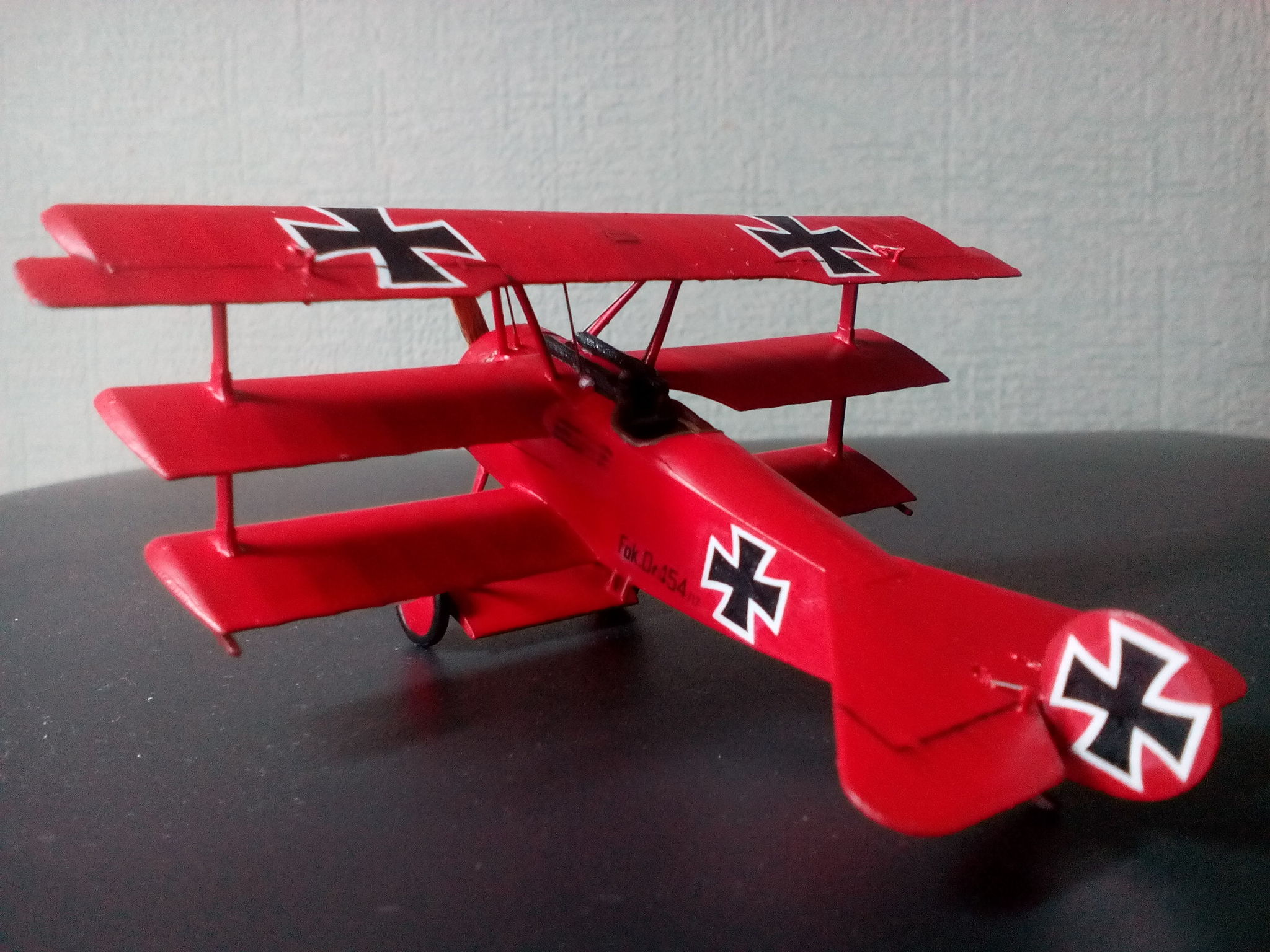 Показан знаменитый красный Dr.I. Манфреда фон Рихтгофена, командира эскадрильи Jasta 11 "Воздушный цирк" (название возникло из-за того что многие самолёты эскадрильи по примеру фон Рихтгофена были частично либо полностью окрашены в яркие цвета - жёлтый, чёрный, белый...). Почему не стандартный зелёный или серый камуфляж? "Я не хочу прятаться от врагов, я хочу их пугать" - отвечал ас, погибший в возрасте 25 лет 21 апреля 1918, но успевший за недолгую жизнь сбить по разным данным от 73 до 84 самолётов противника.