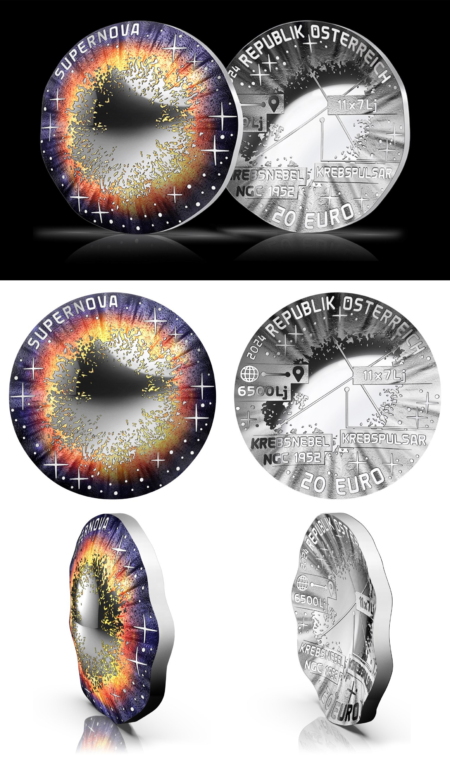 Аверс: рисунок, на котором на вогнутом рельефе изображены крабовидный пульсар (надпись на австрийском "Krebspulsar") и Крабовидная туманность (надпись на австрийском "Krebsnebel"), которые являются остатками сверхновой, наблюдавшейся в 1054 году, расположенной на расстоянии 6500 световых лет от планеты Земля (слева можно прочитать надпись "6500 Lj") и размером 11 × 7 световых лет (справа надпись "11 × 7 Lj"); в нижней части — обозначение "NGC 1952"; в верхней части указано название страны-эмитента "REPUBLIK ÖSTERREICH" и год выпуска "2024"; внизу — номинал "20 EURO".