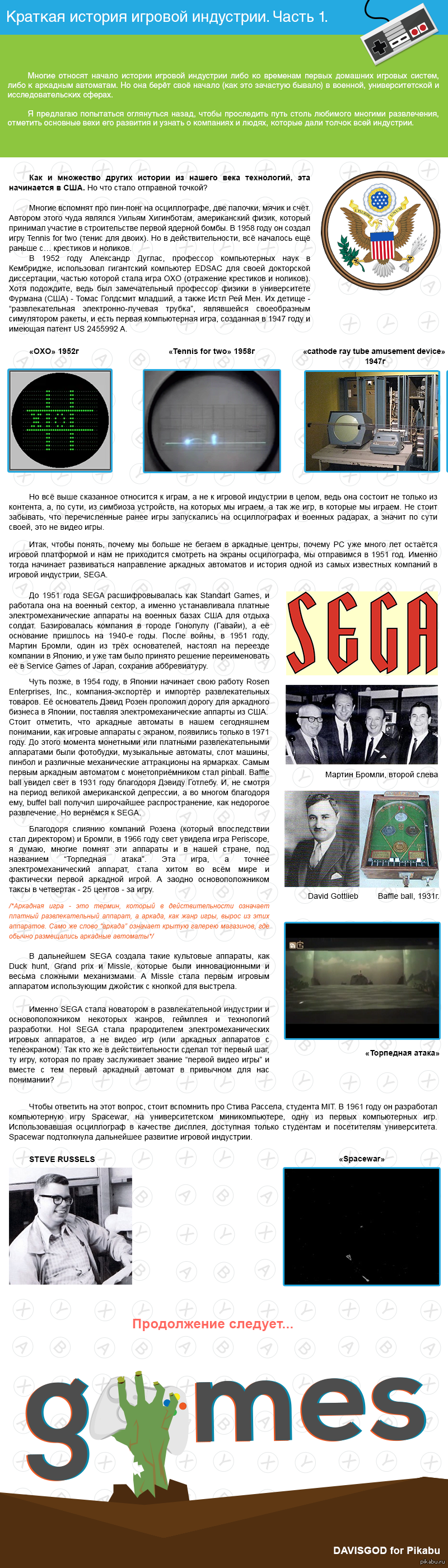 20 davisgod Краткая история игровой индустрии. Часть 1. 12 лет назад Решил заморочится и сделать несколько постов про историю игровой индустрии. Думаю, геймерам будет интересно. [моё] Игры Компьютерные игры История Гифка Длиннопост