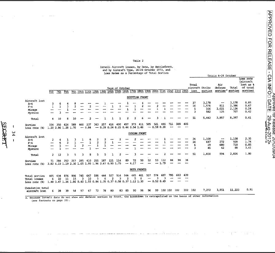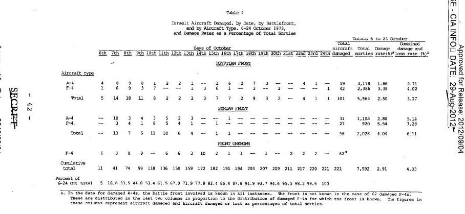 Евреев очень хвалят, мол, быстро сориентировались в ситуации, а высокие потери в начале войны связаны с тем, что ВВС использовались как пожарная команда и были вынуждены действовать в районах с неподавленной системой ПВО. Вообще, действия евреев на Сирийском фронте оцениваются очень высоко, потому что ПВО арабов там было образцовым. Есть достаточно интересные таблицы по суточным потерям на каждом из фронтов.