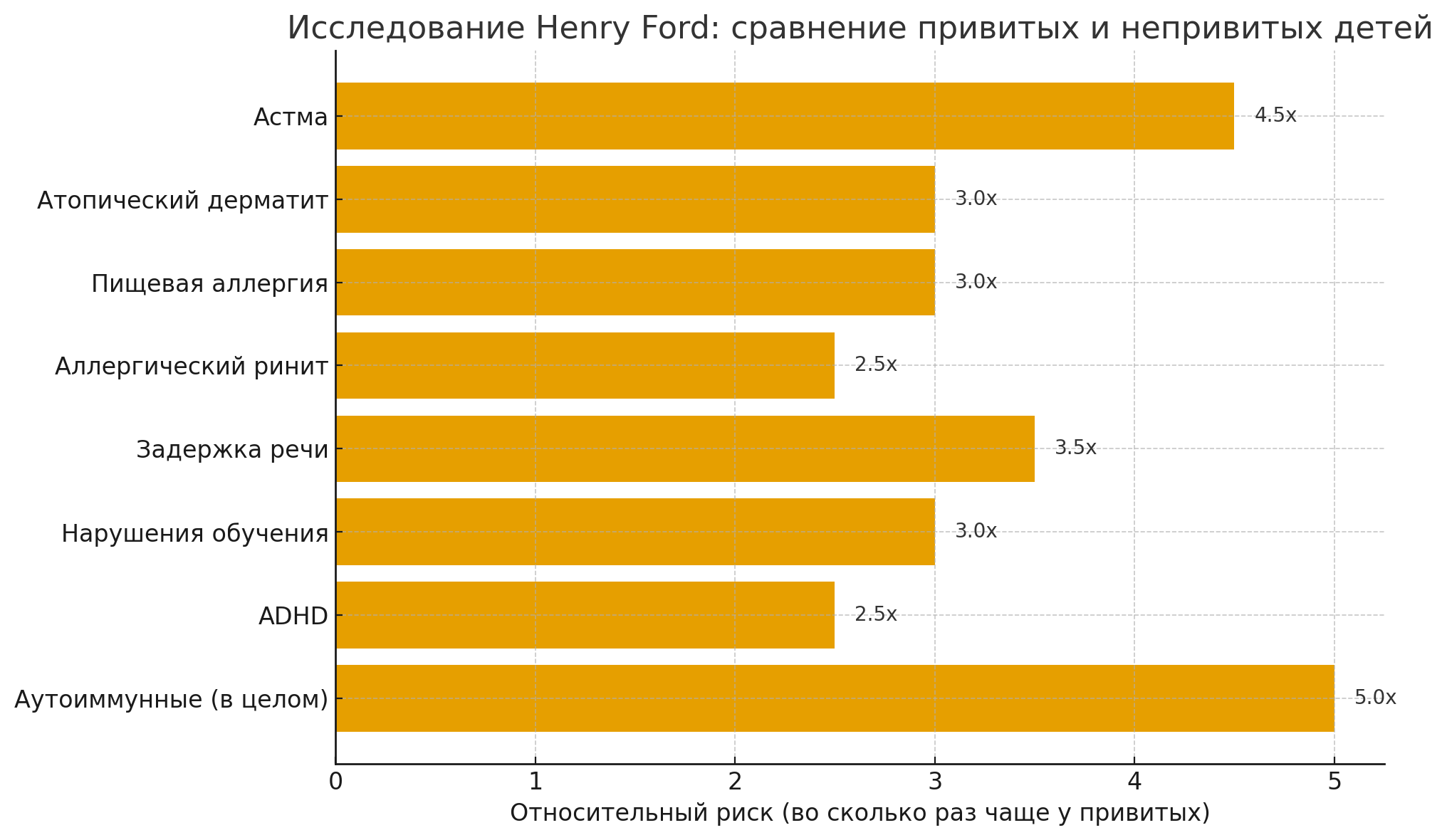 У привитых в 2,5–6 раз чаще встречались хронические заболевания: астма, атопический дерматит, пищевая аллергия, аутоиммунные расстройства, задержка речи и другие нейроразвитийные нарушения.