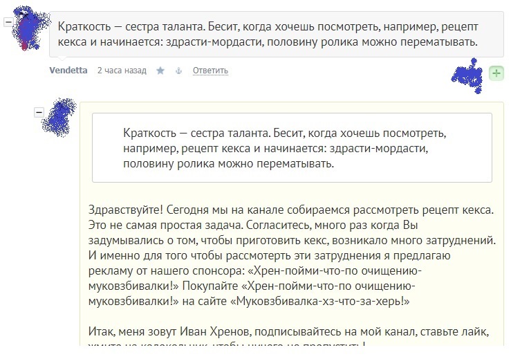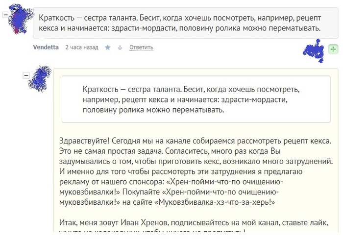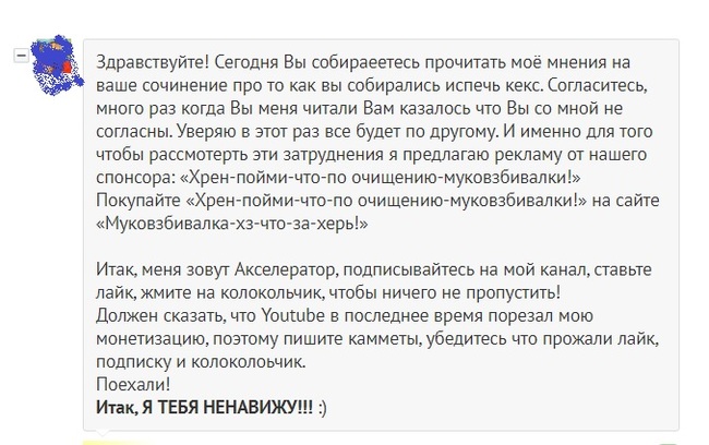 Здравствуйте! Сегодня мы на канале собираемся рассмотреть рецепт кекса. Это не самая простая задача. Согласитесь, много раз когда Вы задумывались о том, чтобы приготовить кекс, возникало много затруднений. И именно для того чтобы рассмотерть эти затруднения я предлагаю рекламу от нашего спонсора: «Хрен-пойми-что-по очищению-муковзбивалки!» Покупайте «Хрен-пойми-что-по очищению-муковзбивалки!» на сайте «Муковзбивалка-хз-что-за-херь!»