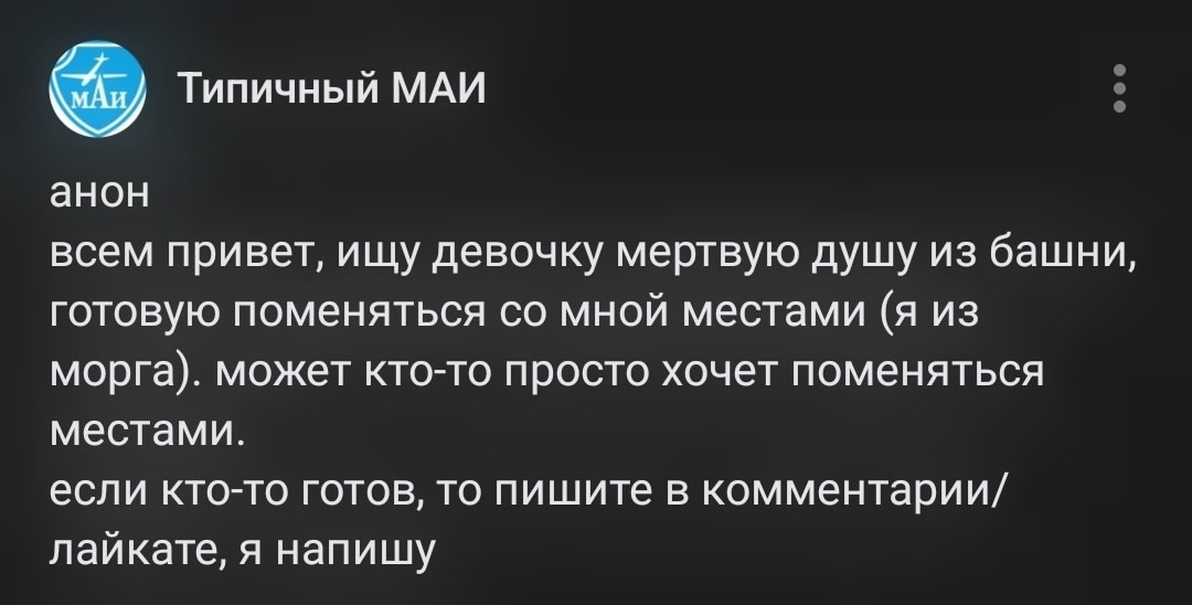 0 Milumir Креативный нейминг 6 месяцев назад Маёвцы, конечно, мастера давать названия своим общагам. Если не знать о чём речь, звучит крипово)) МАИ Название Общежитие Ещё 0