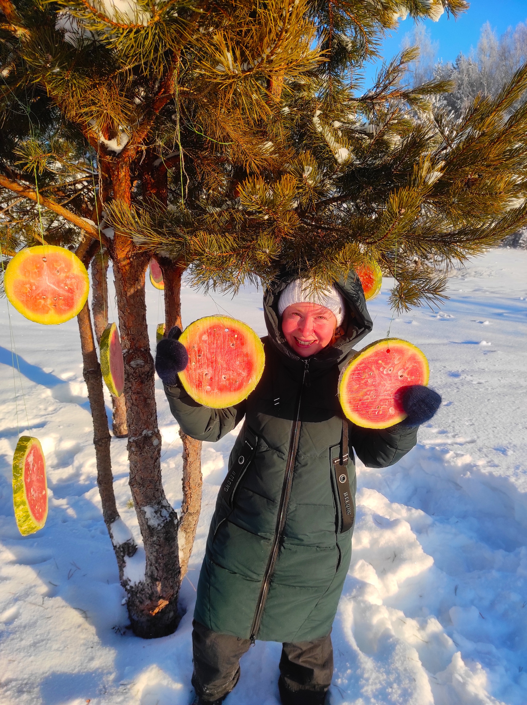 Всем привет! В прошлом году на Новый год решили необычным образом украсить сосну рядом с домом. Взяли и заморозили несколько арбузов. Распилили их пилой на кругляшки, сделали в них отверстия, привязали нитку и развесили на сосну.