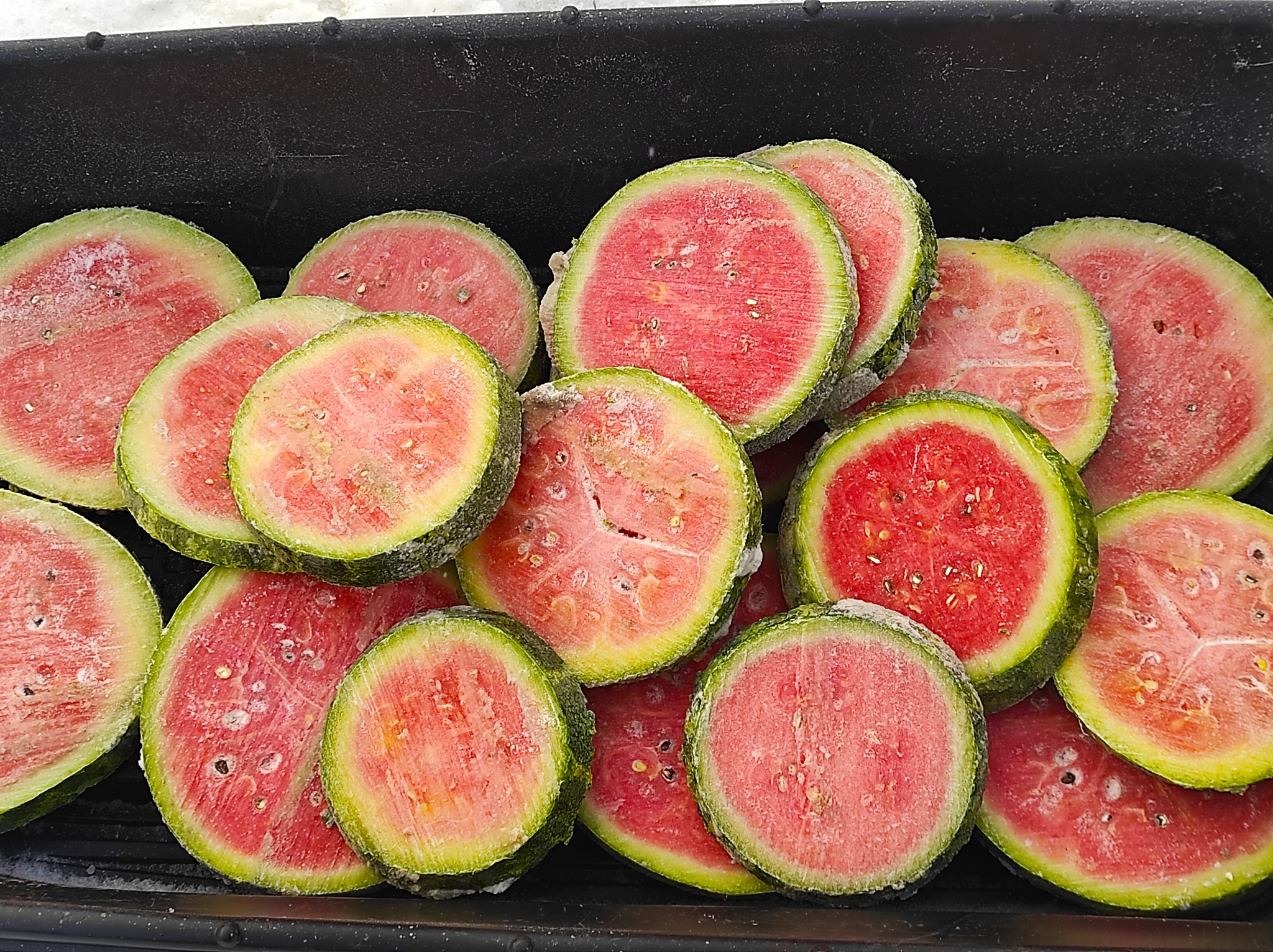 Главное, чтобы мороз был покрепче, иначе арбуз расстает:) Вот такая задумка, скоро Новый год, попробуйте также сделать. Детям точно понравится и гостей удивите!