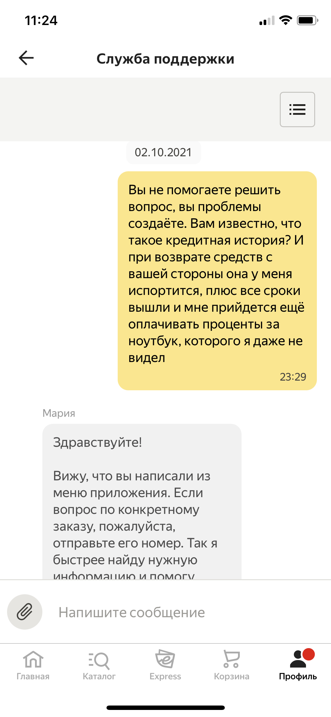 24.09 муж оформил ноутбук в кредит на Яндекс Маркет, 26 сентября должна быть доставка, сегодня 04.10. Кредит есть - ноутбука нет) у них произошёл технический сбой в приложении и нет возможности поменять дату доставки, до сих пор и висит 26 сентября. Служба поддержки и операторы - это отдельный зоопарк, который мертвого с могилы поднимет своим тупизмом, обещают решить вопрос через 24 часа, проходит двое суток, они просто копируют/вставляют предыдущее сообщение и так по замкнутому кругу. Ребят, 21 век на дворе!!!! И не могут решить проблему с сайтом, чтоб поменять дату доставки. Шок! Предлагают сделать отмену заказа, но у нас кредит, соответственно деньги вернуться в банк и это отрицательно повлияет на кредитную историю, на носу ипотека. Если б были наличные, давно б сделали отмену и забыли это как страшный сон. К-клиентоориентированность