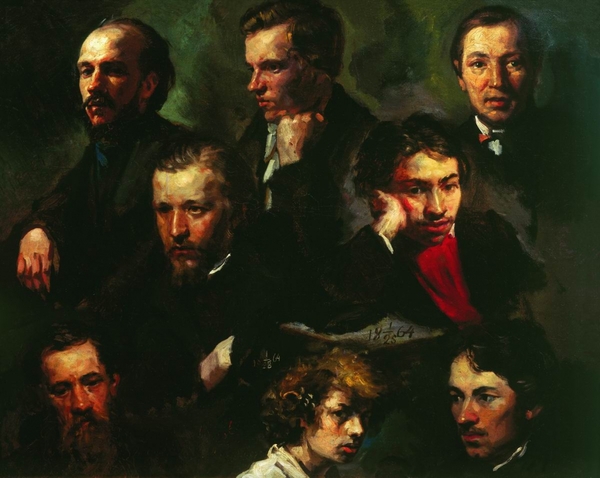 В 1864 году еще в одну артель объединились талантливые живописцы: В. Максимов, В. Бобров, А. Дамберг, А. Калмыков, Н. Кошелев, А. Киселев… В 1864 году Максимов написал эскиз группового портрета членов этого кружка.