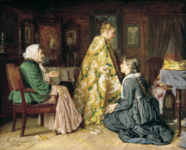 Другая же работа "Примерка ризы", в которой Максимов попытался изобразить забавную городскую сценку – три женщины шьют поповскую ризу, одна из них примеряет её на себя, – оставила зрителей равнодушными.